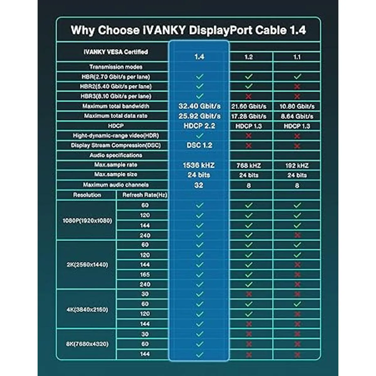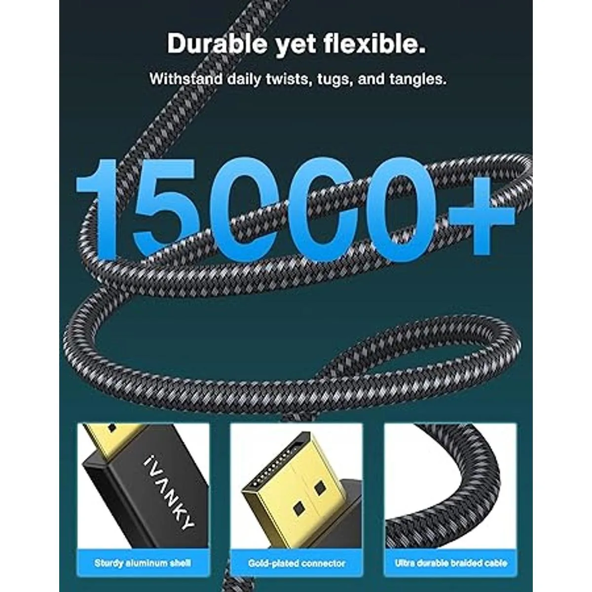 Cable DisplayPort 1.4, cable iVANKY 8K DP de 10 pies 8K 60Hz, 4K 144Hz, 1080P 240Hz, compatible con HBR3, 32.4Gbps, HDCP 2.2, HDR, compatible con monitores de juegos, TV, PC, laptop y más