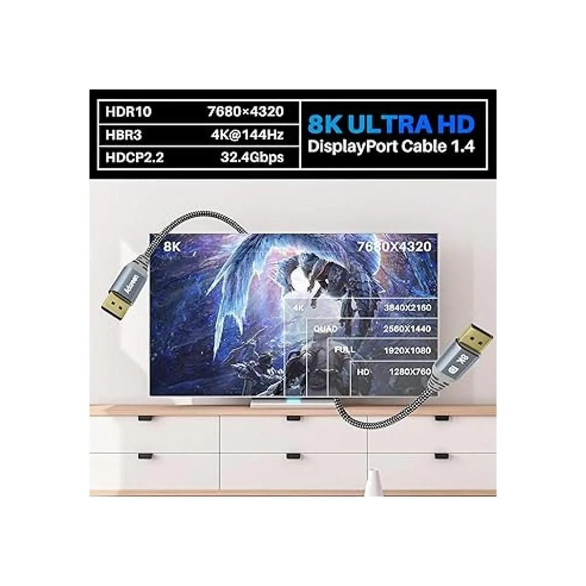 Aviso: no DP a HDMI; no mini Displayport Cable DisplayPort UHD de 8 K Los cables Adoreen DisplayPort 1.4 de alta velocidad soportan resolución de hasta 8K 7680×4320, incluyendo 5K 5120×2880 60Hz, 4K Ultra HD 3840×2160 144Hz y 140 Hz P 2K240Hz165Hz, 1080P Full HD