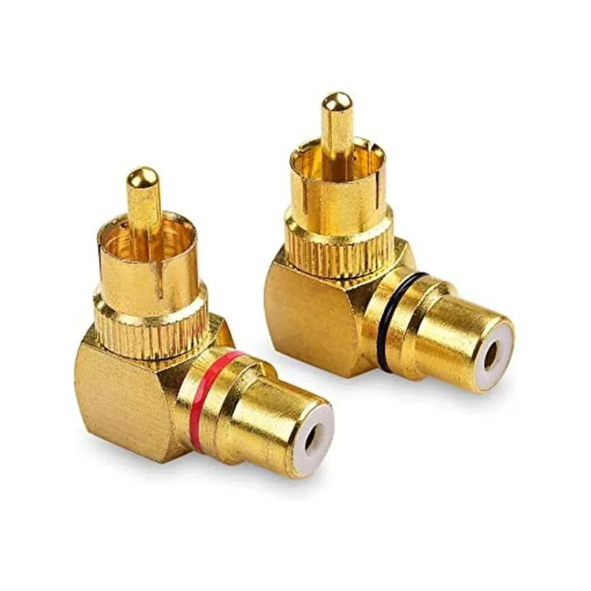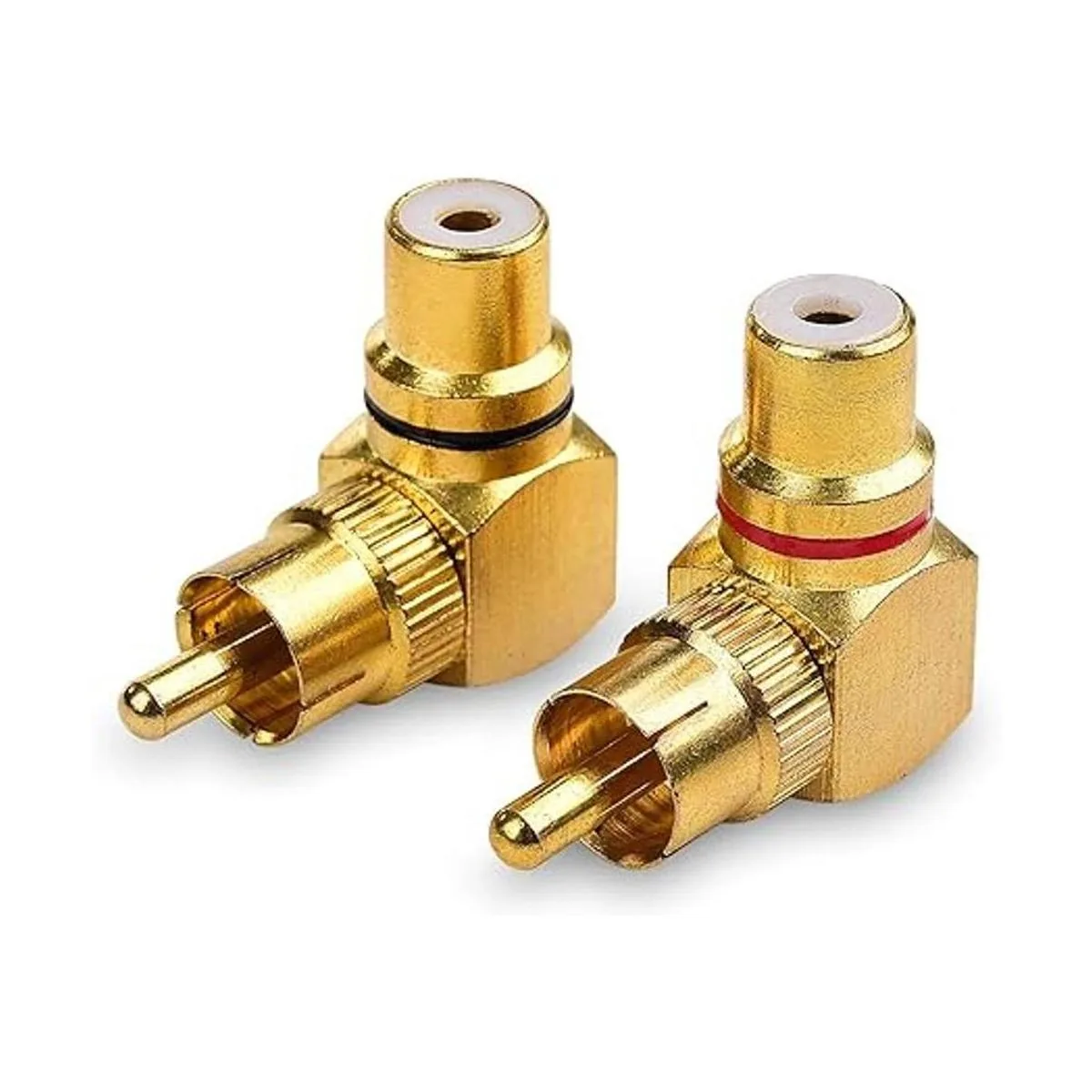 Práctico paquete de 2 adaptadores RCA de ángulo recto para los canales de audio izquierdo y derecho; conecta un adaptador de ángulo RCA a un subwoofer colocado junto a una pared