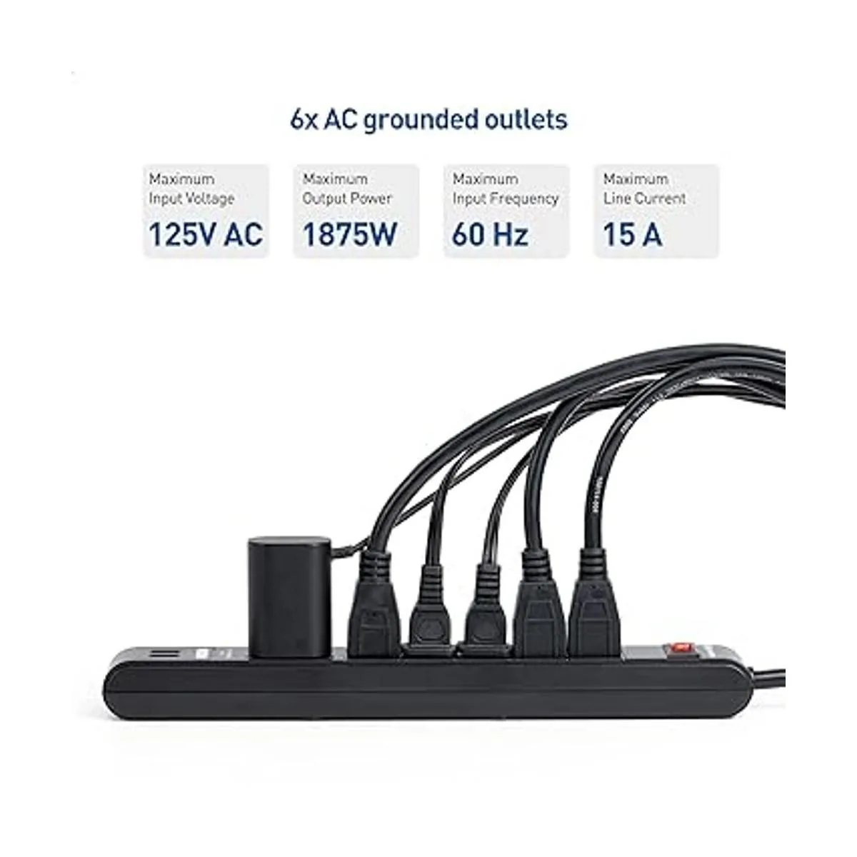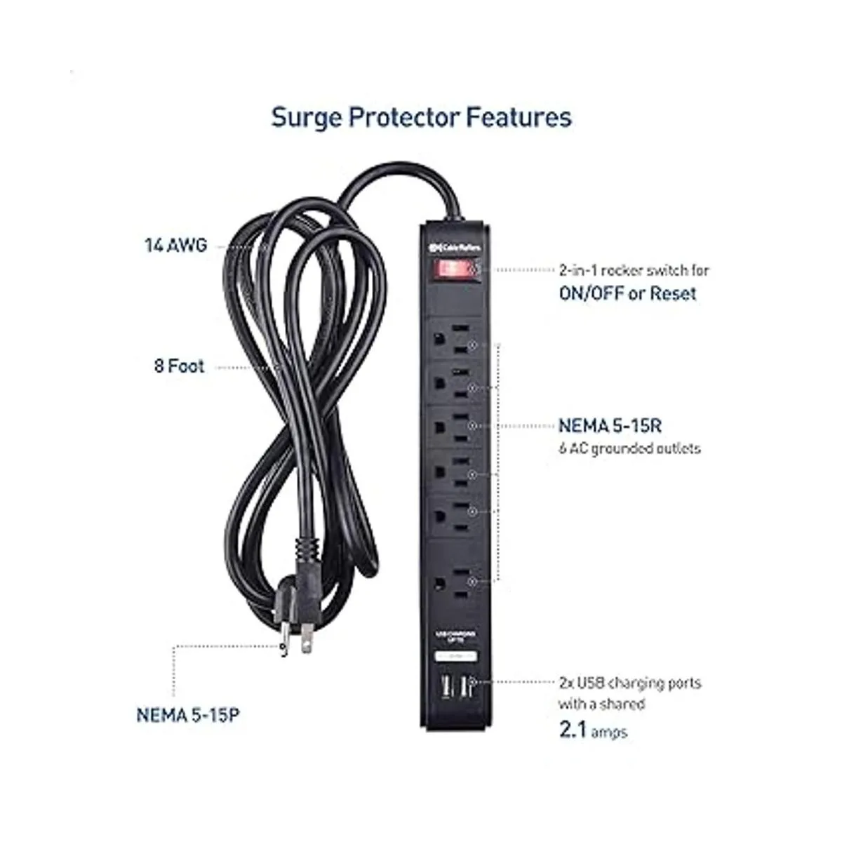 El protector de sobretensiones de 6 tomas proporciona una alimentación centralizada y una estación de carga USB para proteger hasta ocho dispositivos, incluyendo dos dispositivos USB como un smartphone o tableta