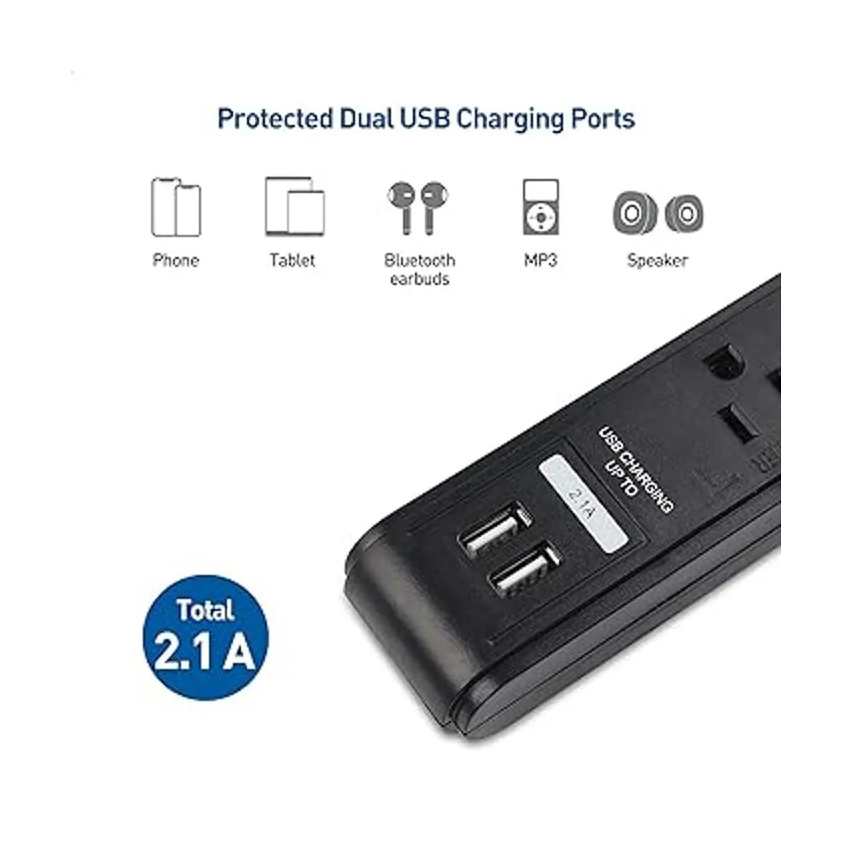 Puerto de carga dual USB 2.1 A, el supresor de sobretensiones se encuentra en el extremo de la tira para un fácil acceso; utiliza los protectores de sobretensiones USB para proteger tus valiosos dispositivos móviles mientras se carga con puertos USB seguros