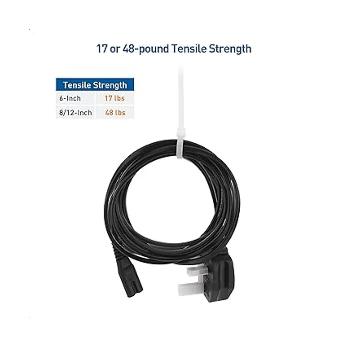 Las bridas de plástico duraderas de un solo uso están clasificadas con una resistencia a la tracción de 17 libras o 48 libras; aumenta la resistencia a la tracción utilizando dos o más juntos en una fila