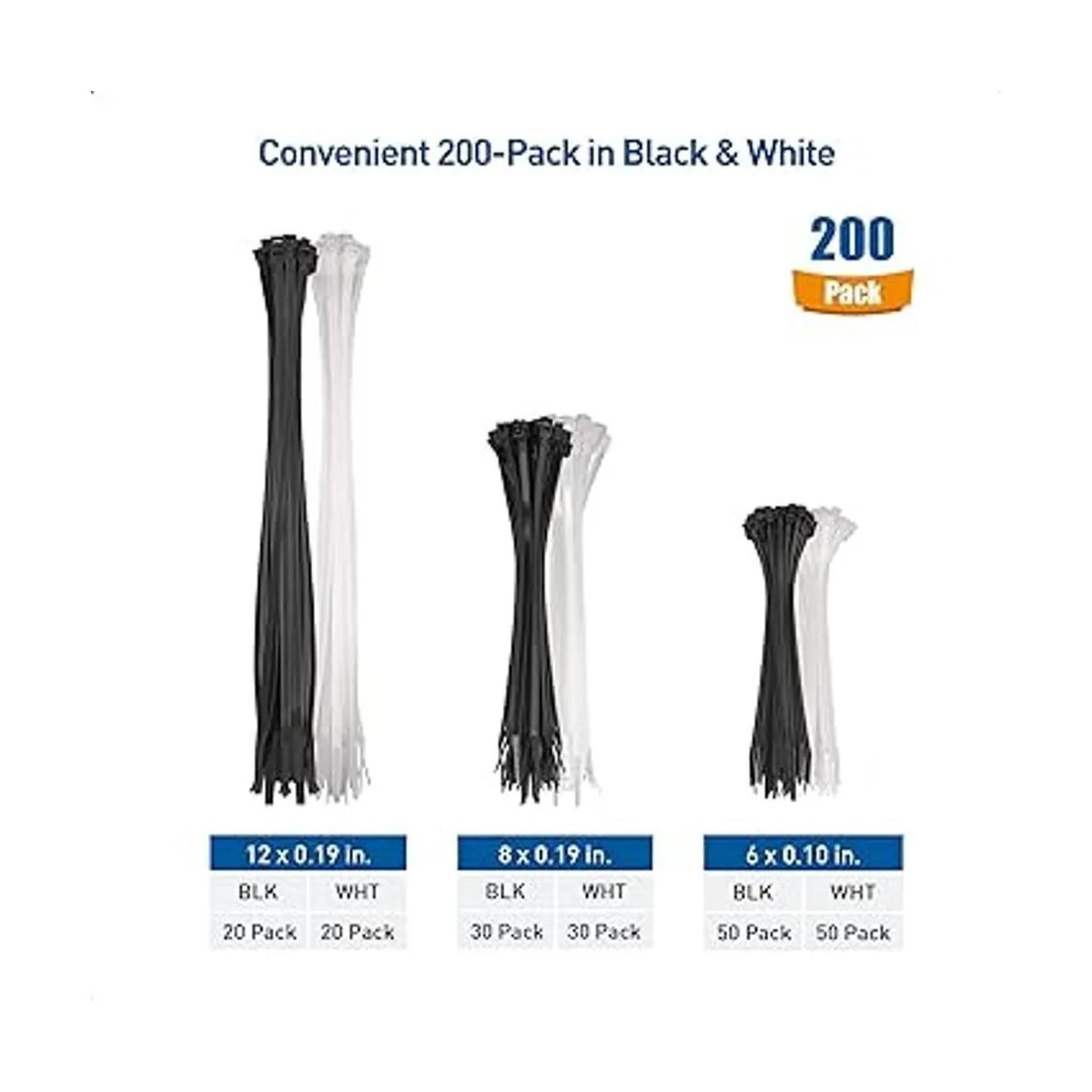 Cable Matters Paquete de 200 bridas de nailon autobloqueables para interiores y exteriores, de 8,12 pulgadas, varios tamaños envolturas de corbata, bridas para cables, cremalleras en blanco y negro