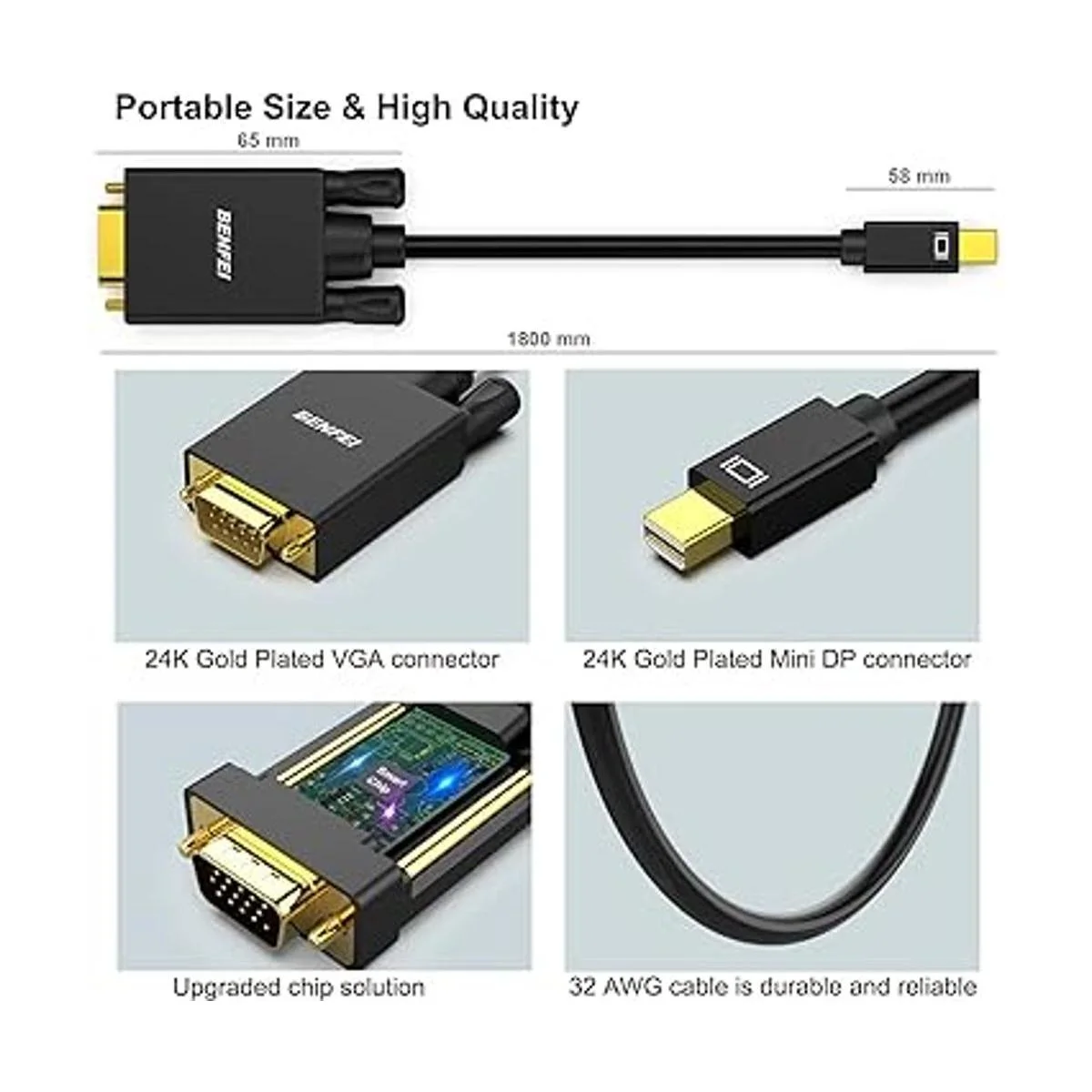 excelente transmisión: el cable benfei mini displayport a vga de 6 pies utiliza una mejor solución de chip y blindaje múltiple profesional para transmisión de datos instantánea y precisa. no es compatible con thunderbolt 3