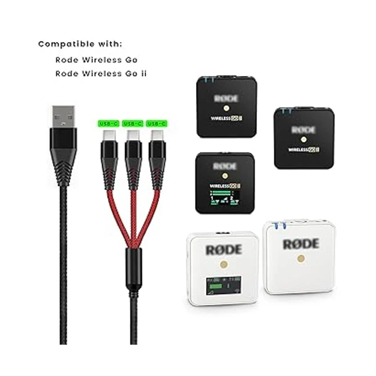 Cable USB C 3 en 1 de repuesto para sistema de micrófono Rode Wireless Go II, cable de carga trenzado de nailon con 3 enchufes tipo C de 4 pies