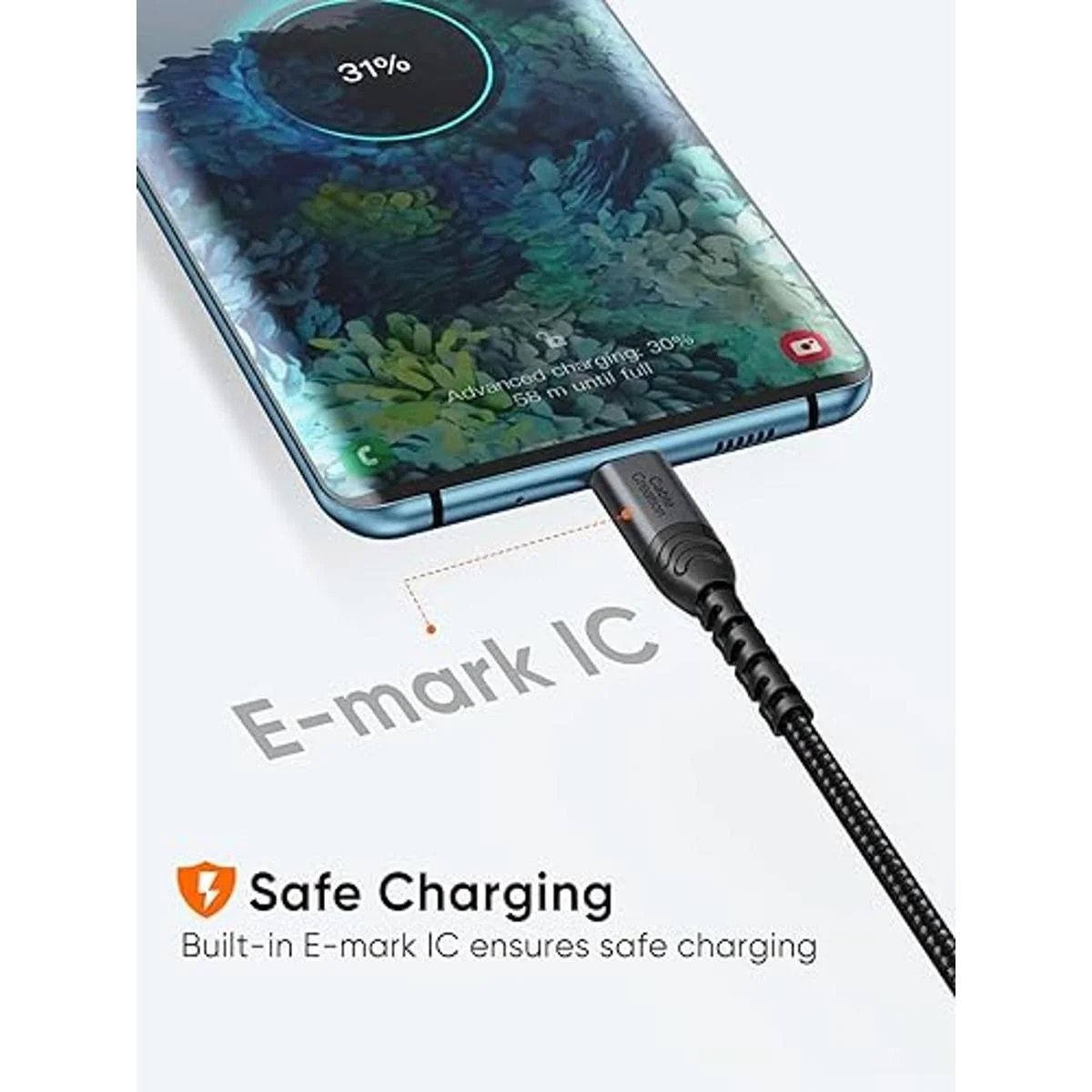 Chip inteligente EMark: el cable tipo C a tipo C está diseñado con un chip Emark que garantiza la estabilidad, precisión y seguridad del voltaje de carga y la corriente, protegiendo tu dispositivo del sobrecalentamiento y ofreciendo una carga segura.