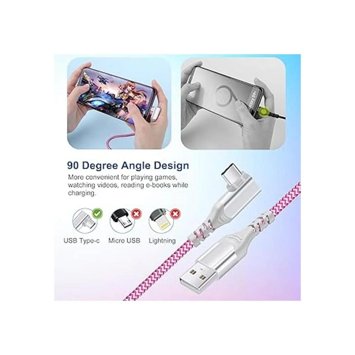 Diseño de ángulo recto mejorado: el cable USB C tiene un innovador diseño en forma de L de 90 grados, que puede evitar eficazmente la flexión del extremo del cable y prolongar la vida útil del cable. Diseño ergonómico de ángulo recto, hace que juegos, ver videos, leer libros electrónicos sea más cómodo y cómodo mientras se carga. Especialmente buena opción para jugadores y amantes del video. Nota: para teléfono con una funda, soporta una funda delgada de 1 pulgada
