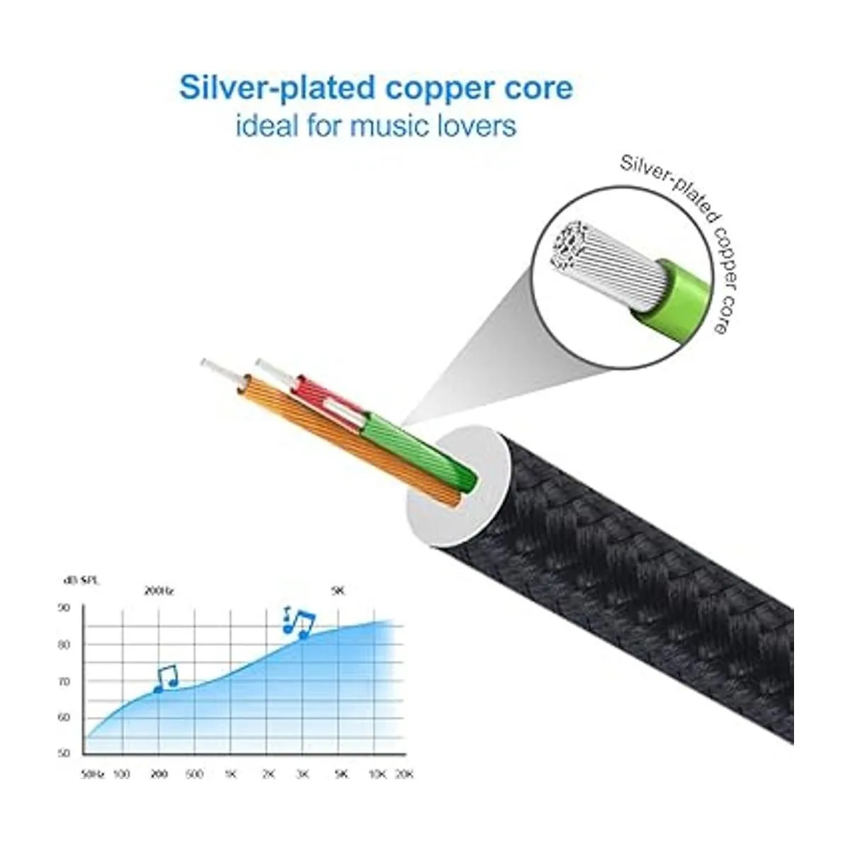 Núcleo de cobre plateado sin oxígeno: que puede proporcionar la máxima conductividad y durabilidad y transferir señal de audio de alta pureza sin distorsión, alta fidelidad, ideal para los amantes de la música.