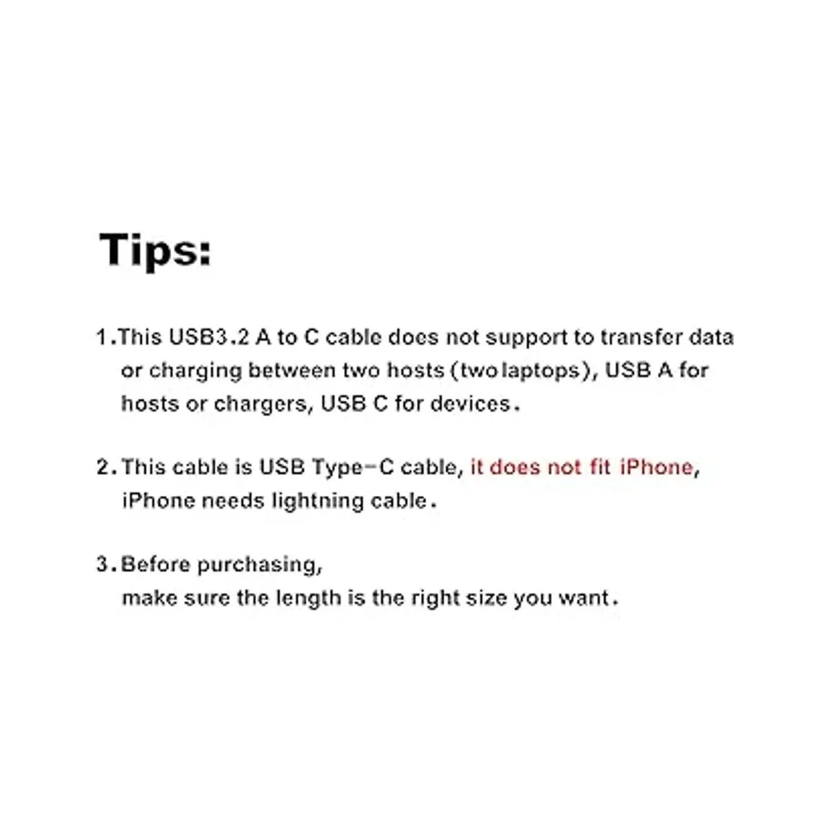 Gran compatibilidad: este cable A a C es compatible con SSD externo USB C y otros dispositivos USBC/Thunderbolt 3. Si no estás seguro de tu dispositivo, por favor dinos y responderemos a tu pregunta. El puerto USB: laptop/PC/cargador; el puerto USBC: teléfono/HDD, etc