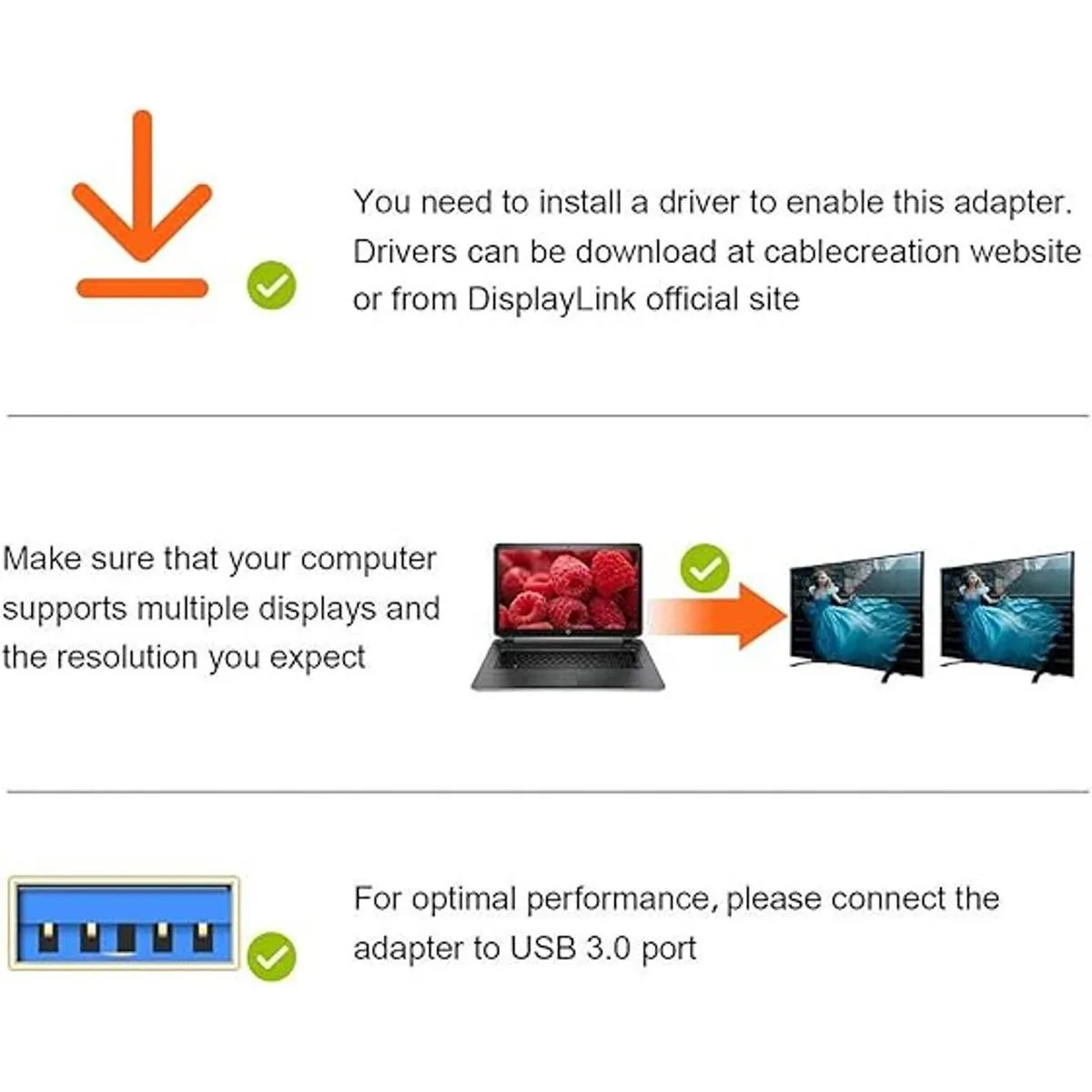 Nota: 1. Antes de usar el adaptador, necesitas instalar un controlador para habilitar este adaptador, los controladores se pueden instalar en el sitio web de cableado, el sitio oficial de DispplayLink o ponerte en contacto con nosotros en cualquier momento; 2. CableCreation ofrece una garantía de dos años y soporte técnico de por vida, cualquier problema por favor ponte en contacto con nosotros por primera vez.