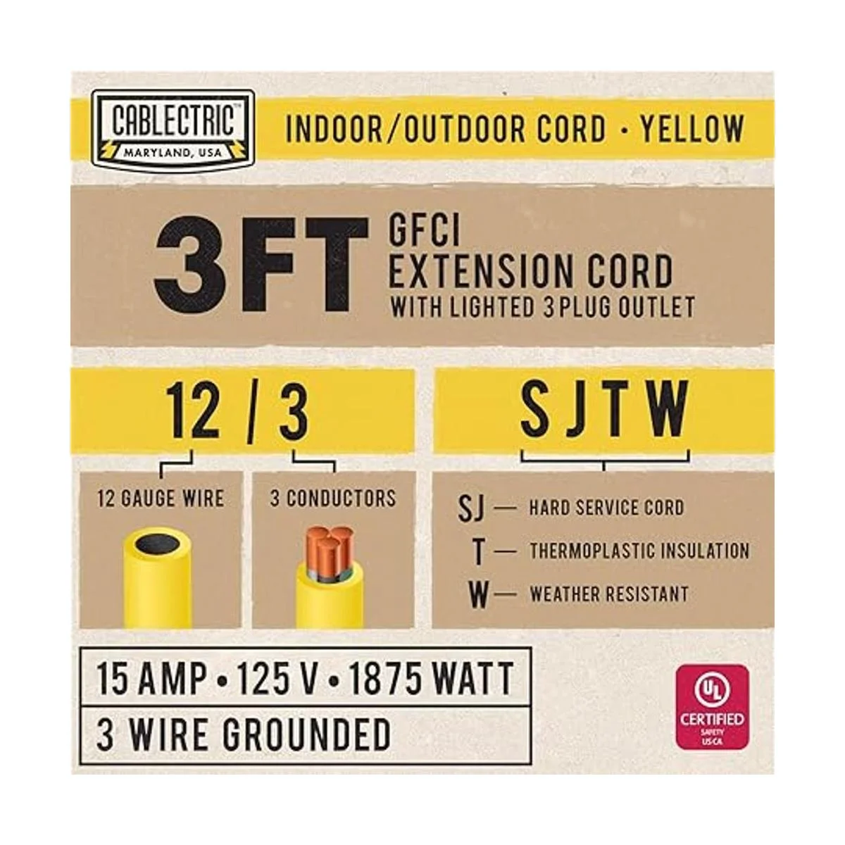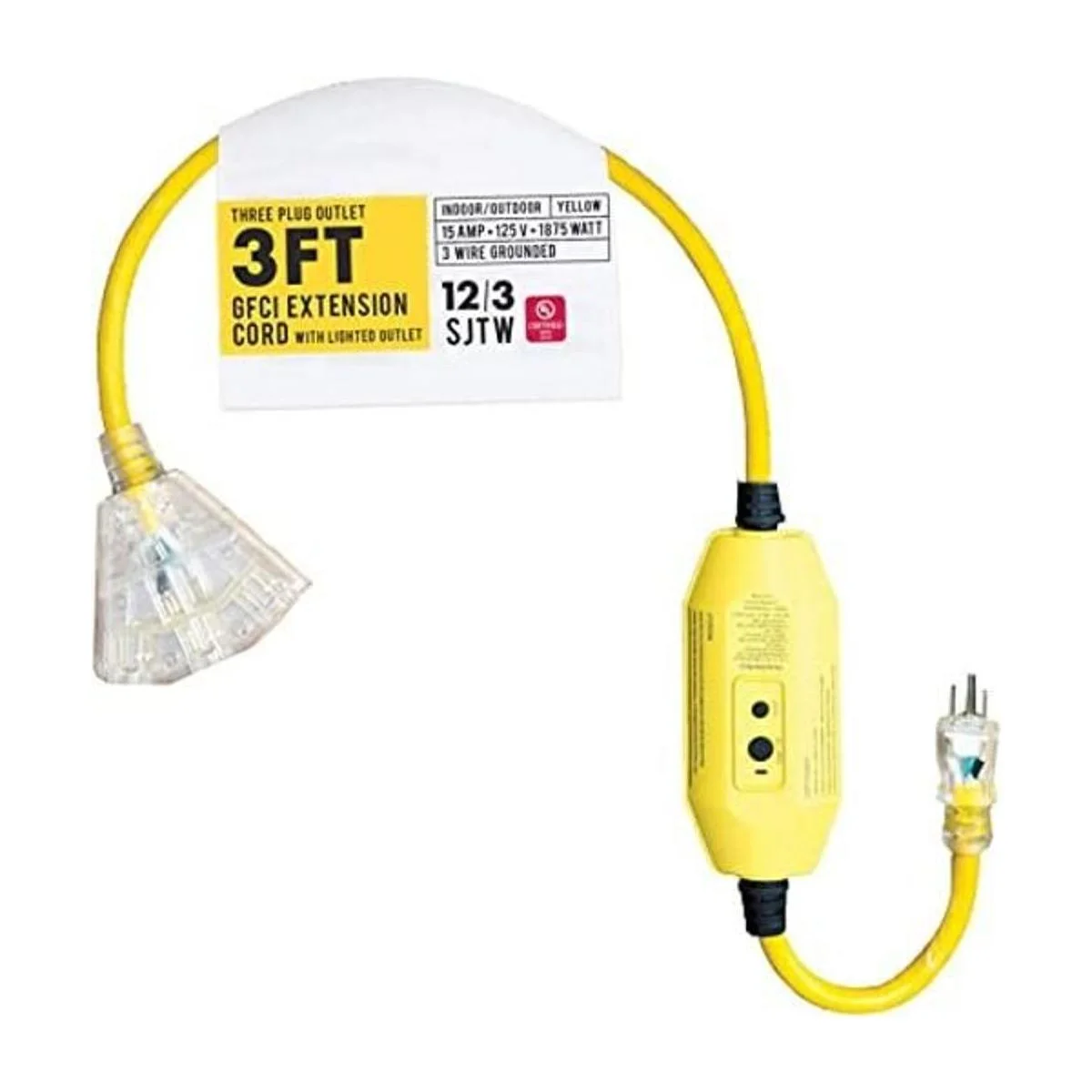 Cablectric Cable de extensión GFCI para exteriores de 3 pies con 3 tomas de corriente, 15 amperios, 123 SJTW, cable eléctrico de coleta amarillo iluminado de calibre 12 con enchufe de tierra de 3 clavijas