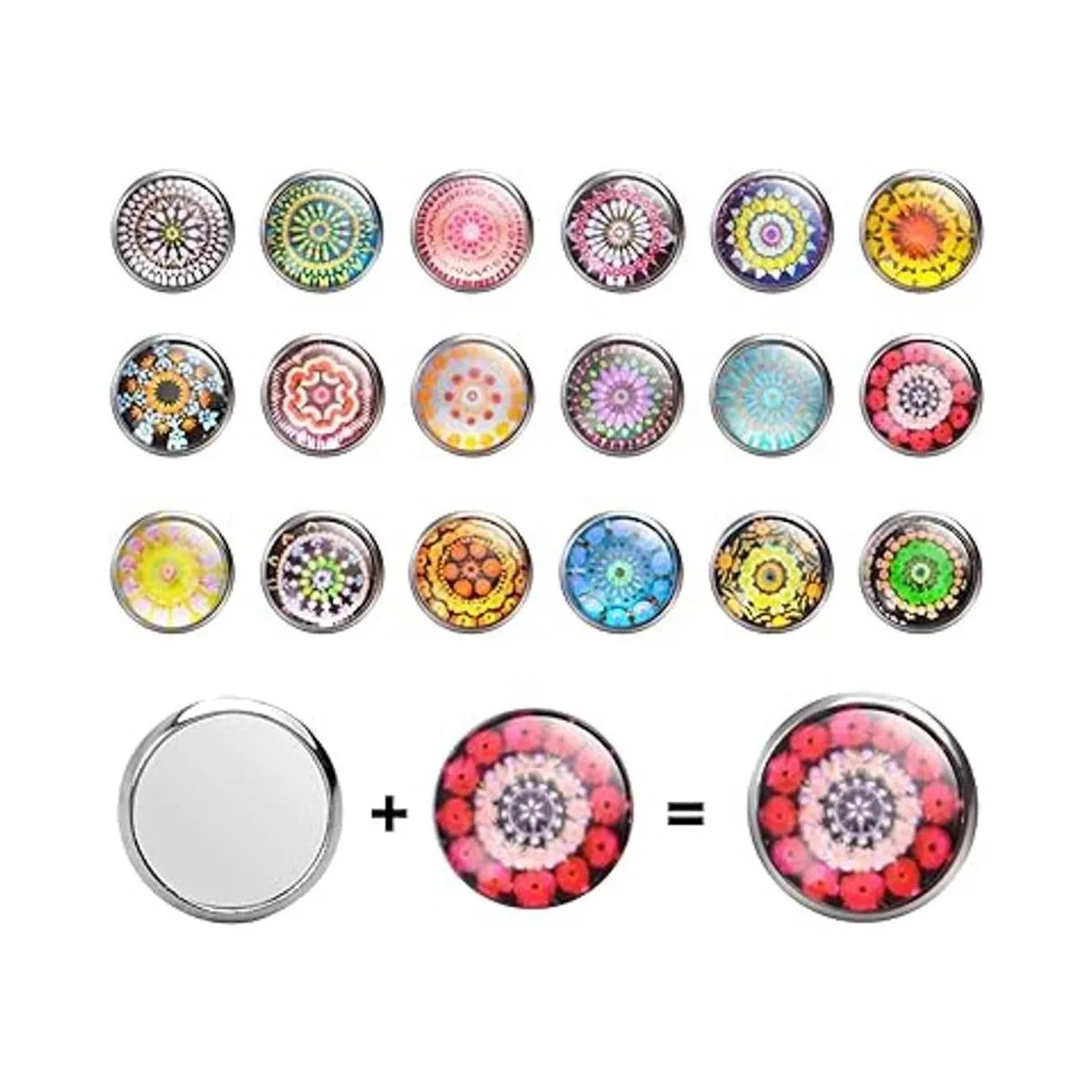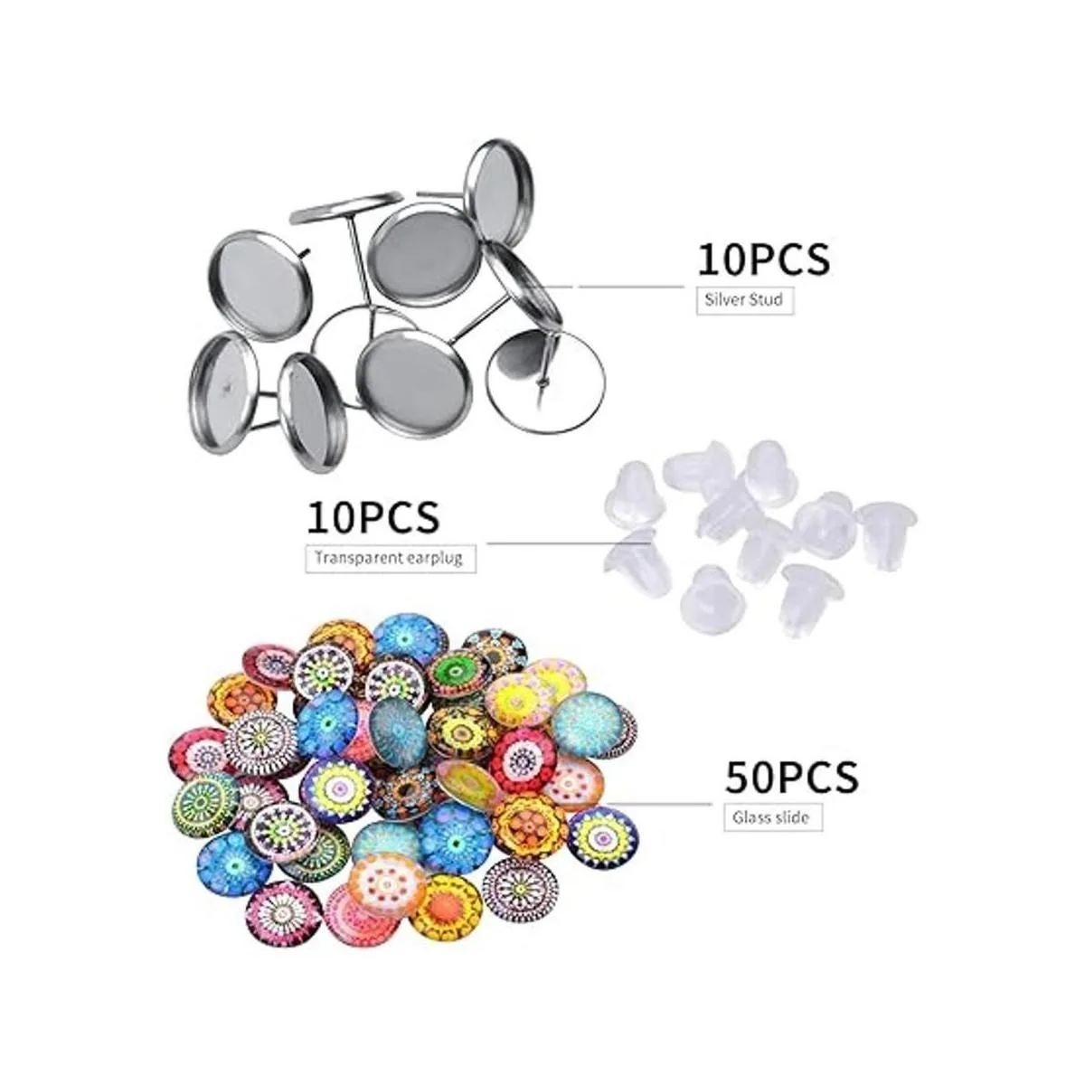 Cabujones de cristal impresos, 50 piezas de 18 estilos de caleidoscopio con espalda plana de cristal de cabujones 0.472 in con 10 pendientes de plata en blanco y 10 pendientes transparentes para la fabricación de joyas.
