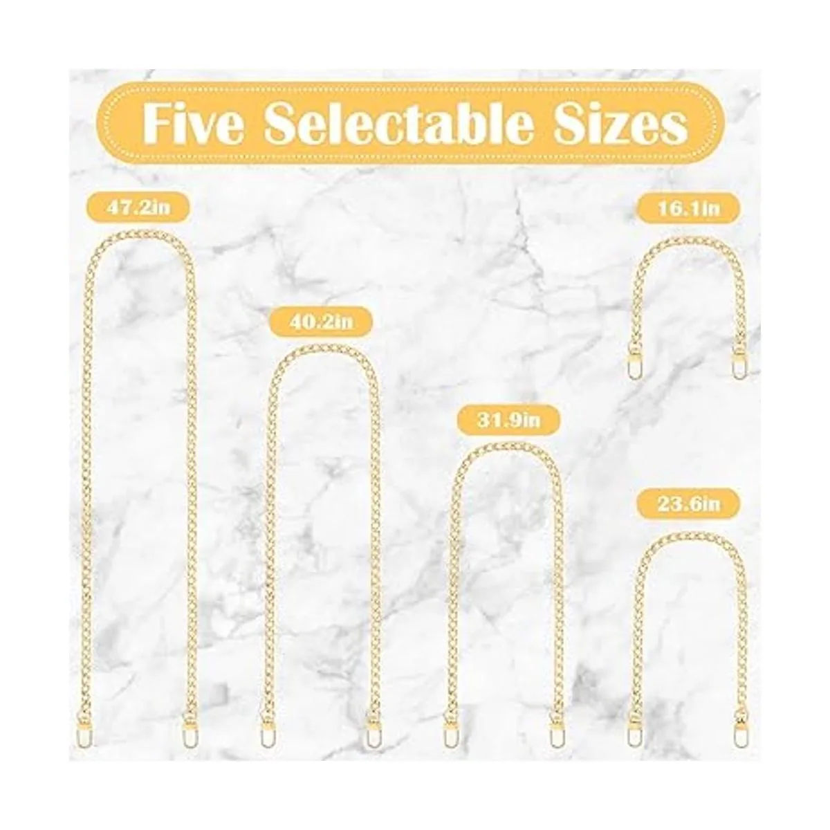 Correas de cadena de metal de 5 tamaños: el juego incluye 5 tamaños de correas reemplazables de cadena dorada para adaptarse a bolsas de todos los tamaños y estilos, incluyendo pero no limitado a bolsas, hombros, mensajeros y embragues. Ancho de la cadena: 0.315 in, grosor del alambre: 0.079 in, longitud: 15.4 pulgadas/31.4 pulgadas/47.2 pulgadas