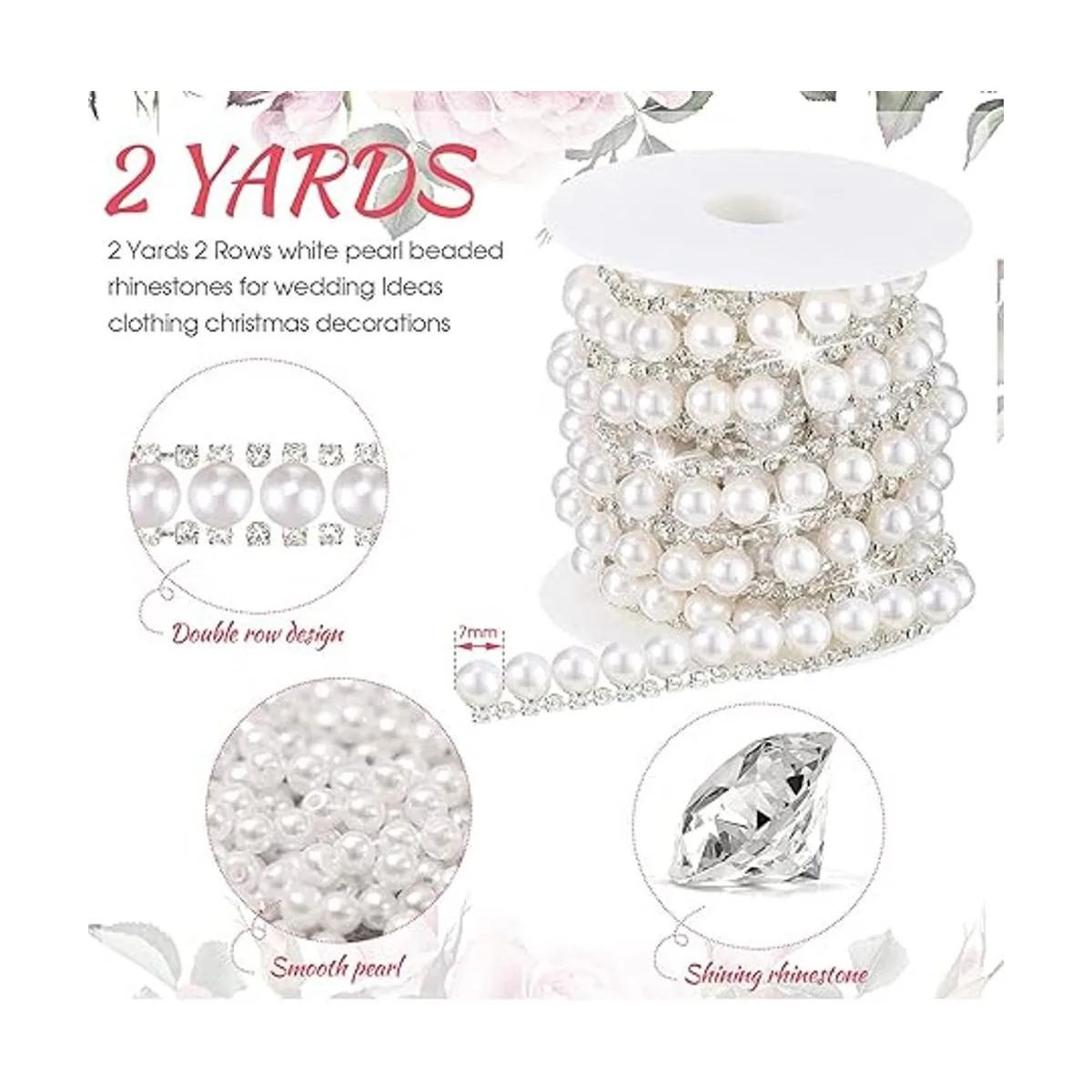 Cadena de diamantes de imitación de 2 yardas con perlas y diamantes de imitación, cadena de perlas para manualidades de diamantes de imitación y adornos de perlas, adornos de perlas de imitación para boda (estilo clásico)