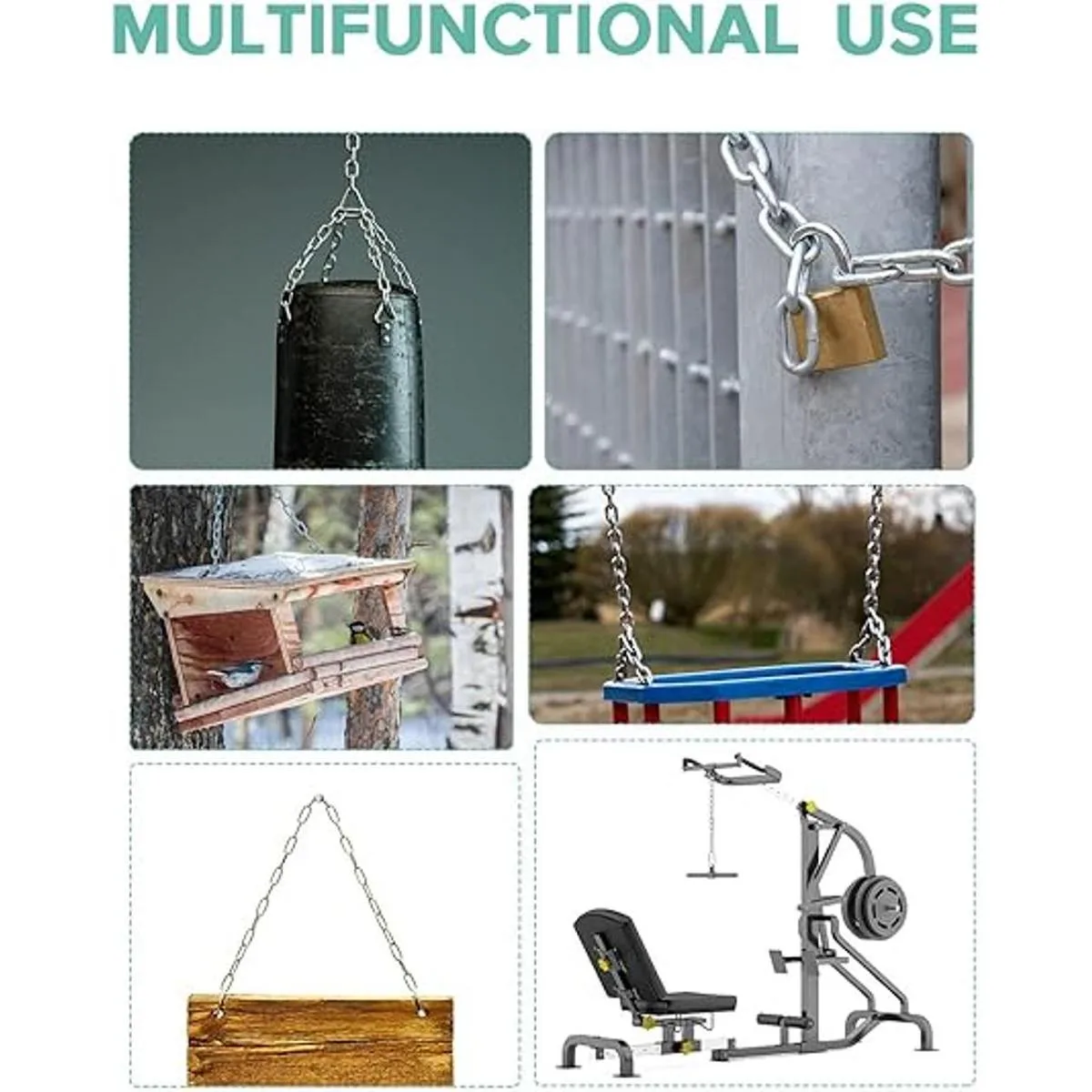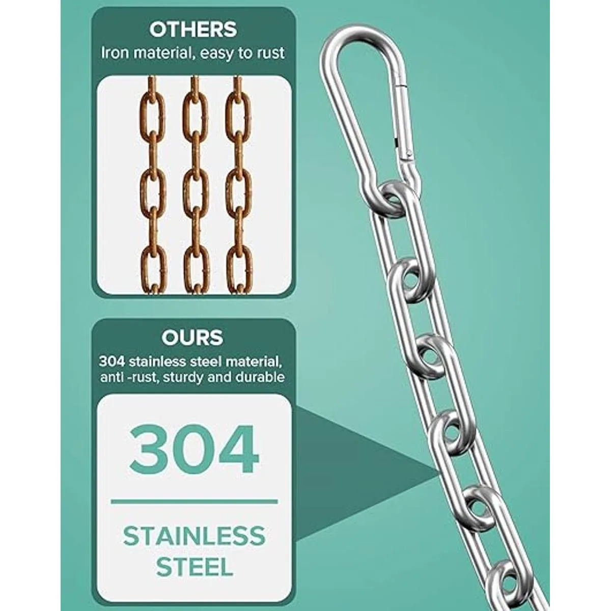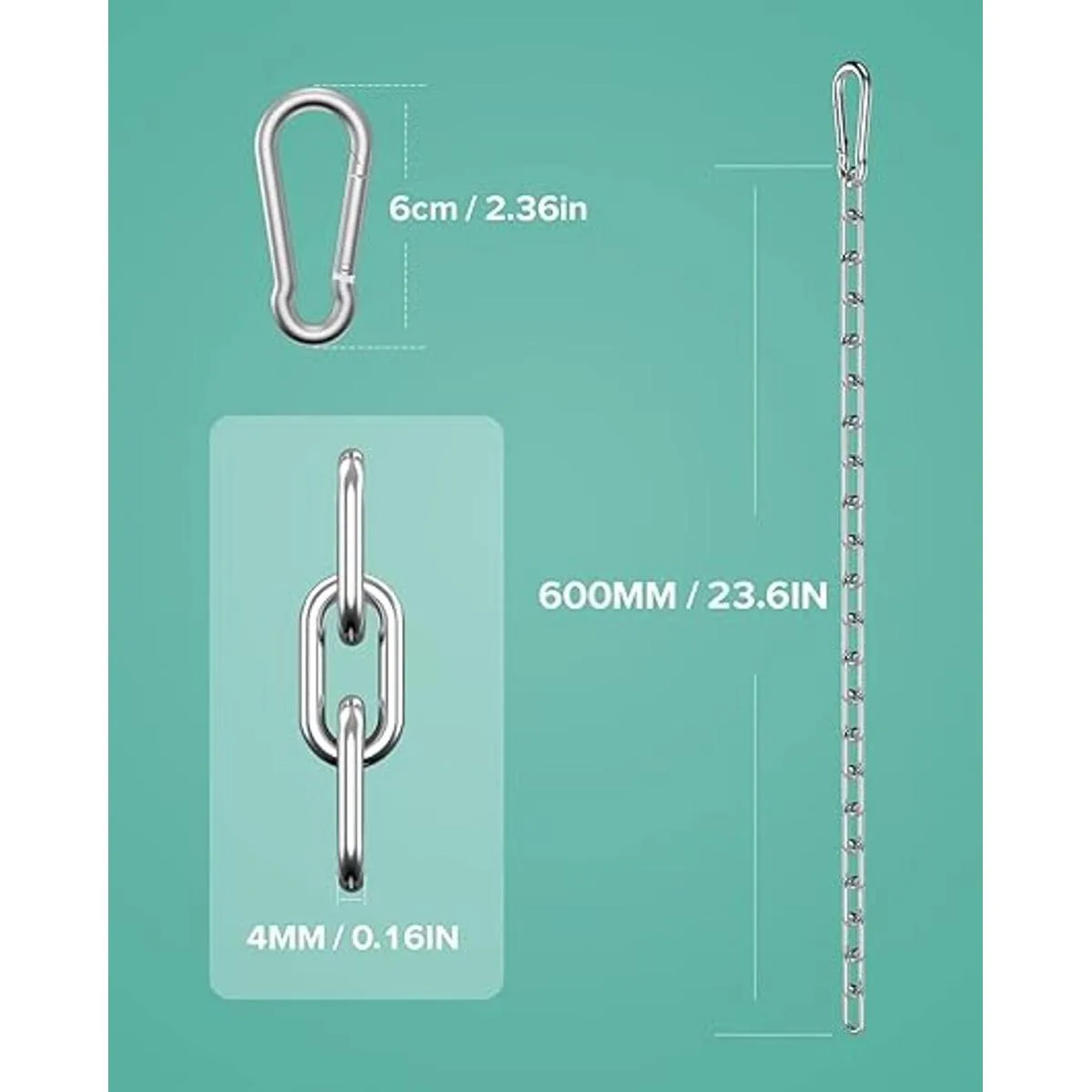 Nota: 300 libras estará bien, no lo utilices para equipos de escalada o seguridad. Se utiliza para remolcar, colgar tuberías, tirar de muñones, puerta trasera, seguridad de carga, registro. o alrededor de equipaje, bolsos, maletas, bolsos, vallas. También es perfecto como cadena para mascotas, cadena para colgar ropa, cadena antirrobo, cadena de anclaje y mucho más. Ten en cuenta los detalles de las tallas.
