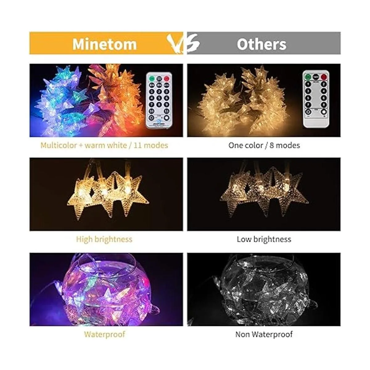 Opciones multicolor en 1 cuerda: estas luces de cadena de estrellas tienen las opciones de color multicolor y blanco cálido, colores de luz populares en una sola cadena de luces, ahorrando dinero y espacio, pero creando un ambiente animado
