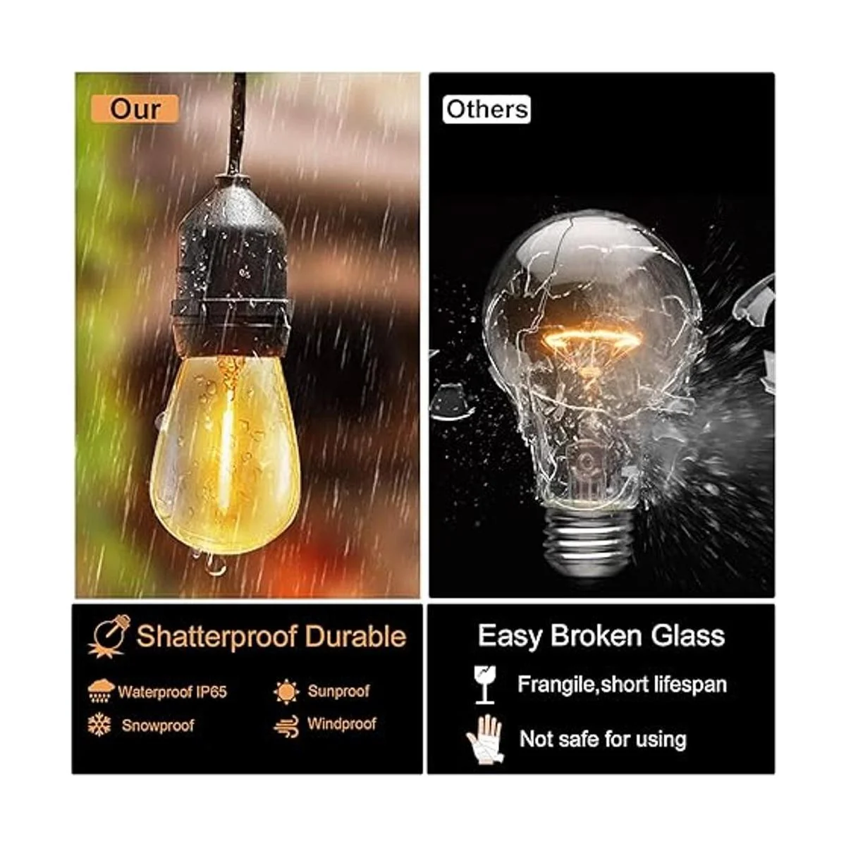 Cadena de luces inastillables para exteriores: las luces Edison para exteriores están hechas de plástico resistente a los impactos, mucho inastillables que las bombillas de vidrio tradicionales, mucho más seguras para usar incluso si las luces de bistró se caen o se vuelan por el viento. La mejor opción de colgar luces LED como luces de patio, luces de patio, luces de mercado de porche, luces de fiesta, luces de pérgola, luces de bistró.