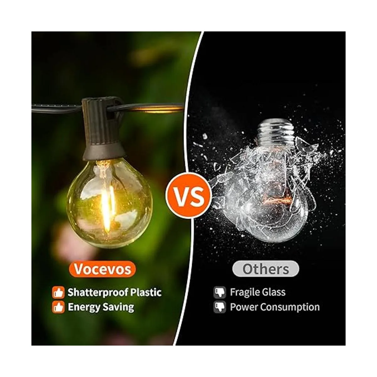 Garantía de seguridad: la cadena de luces Vocevos de 100 pies para exteriores ha pasado por la certificación ETL. La certificación internacional está más segura. Alambre de cobre de alta calidad y 52 bombillas LED de PVC resistentes que hacen posible una iluminación más larga y brillante. Estas bombillas de plástico se mantendrán claras como las bombillas de vidrio y no se oxidan.