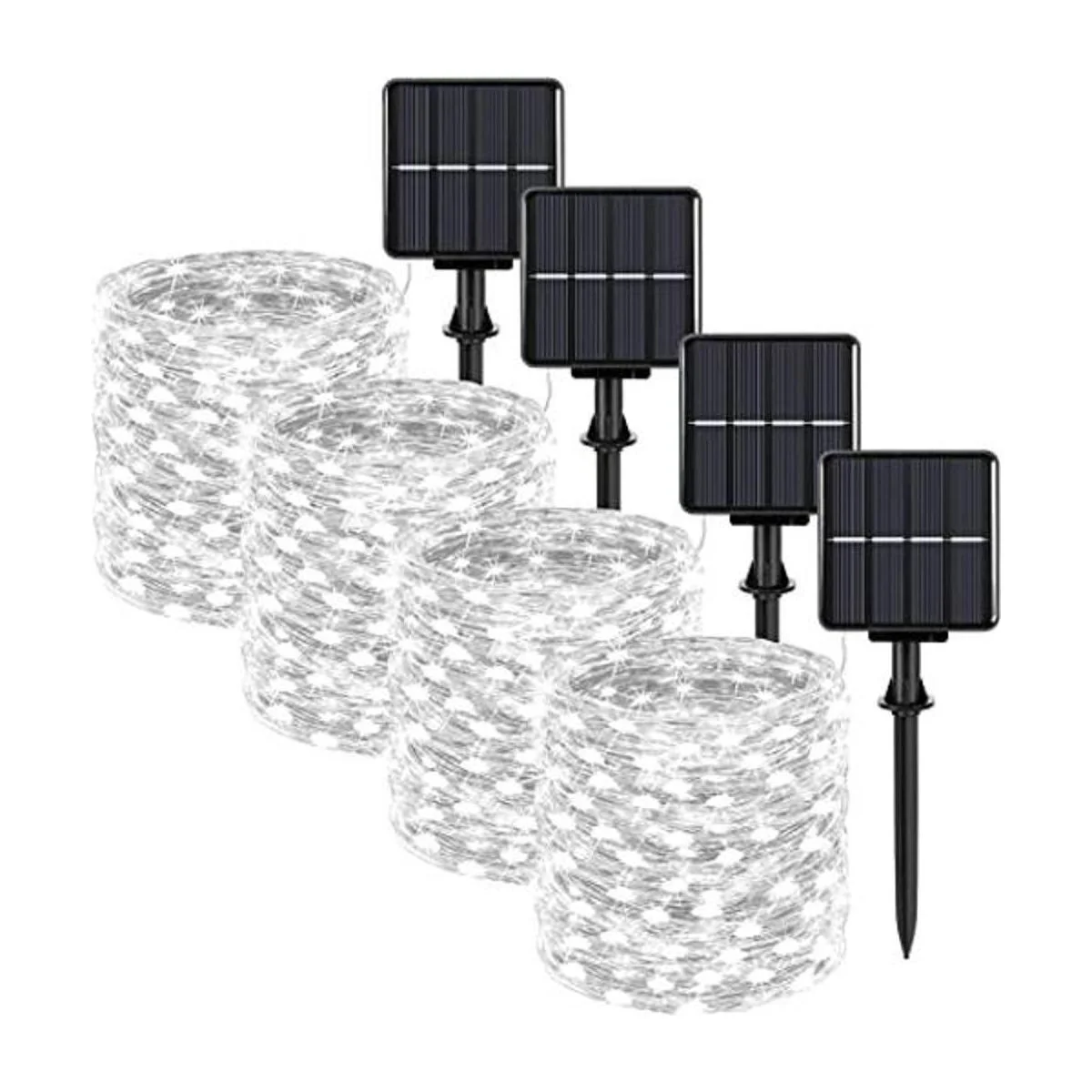 Cadena de luces solares extralargas de 288 pies, paquete de 4 unidades cada 200 LED al aire libre parpadeante luces impermeables 8 modos de iluminación luz del día blanco plateado luces de alambre para cubierta, jardín, valla de jardín, piscina