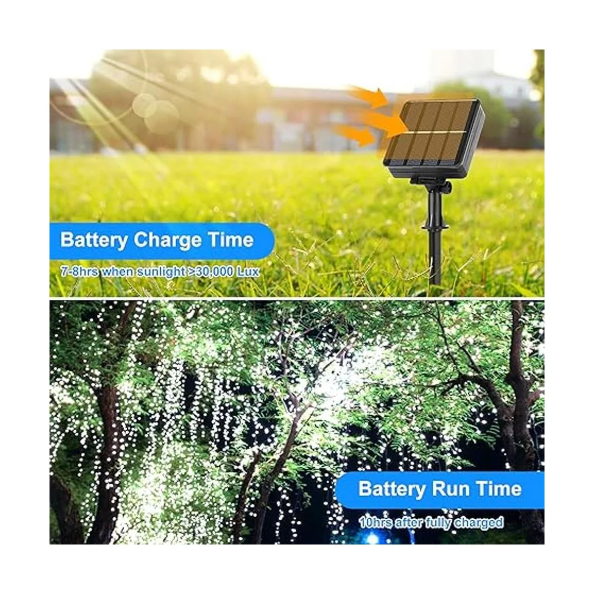 Cadena de luces LED alimentadas por energía solar : estas tiras de luces mejoradas no requieren tomas de corriente y ayudan a reducir mucho tus facturas de electricidad aprovechando la luz solar como fuente de alimentación. Muy prácticas de usar, ya que se encienden automáticamente cuando llega la noche y se apagan cuando sale el sol. Líbrate de tener que operarlo manualmente para el encendido y apagado diario. El panel solar completamente cargado es capaz de mantener las luces encendidas durante 10 horas, el suficiente tiempo para que disfrutes de fiestas nocturnas con tus amigos