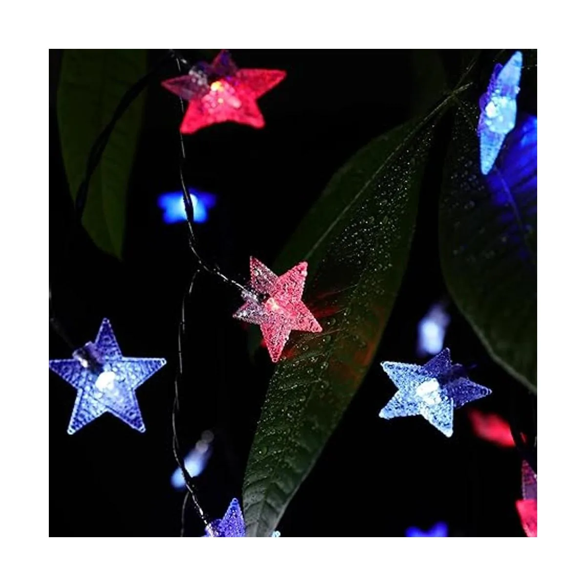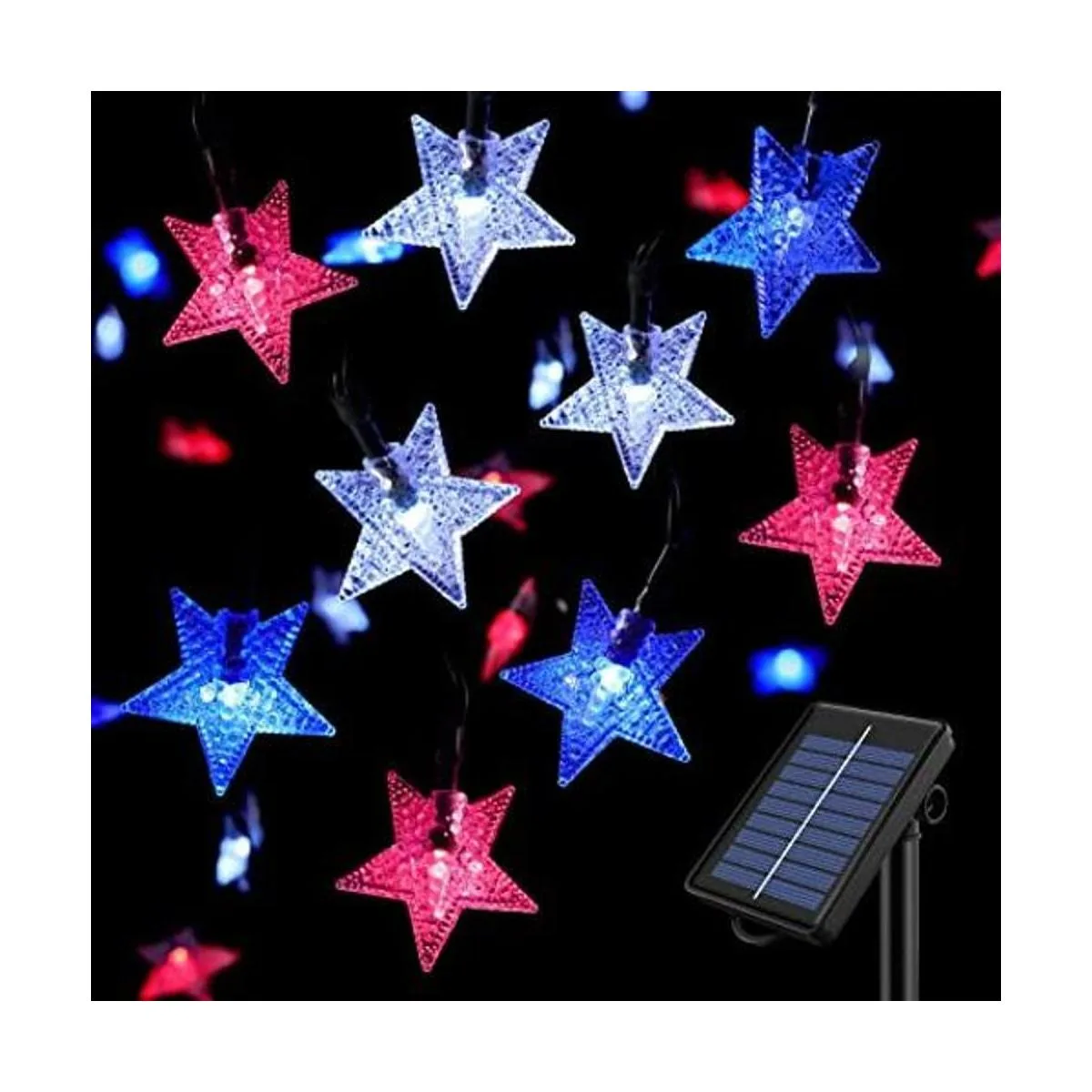 Cadena de luces solares para exteriores de 50 LED con forma de estrella de cristal en forma 3D para decoración de jardín color azul blanco y rojo bandera de Estados Unidos