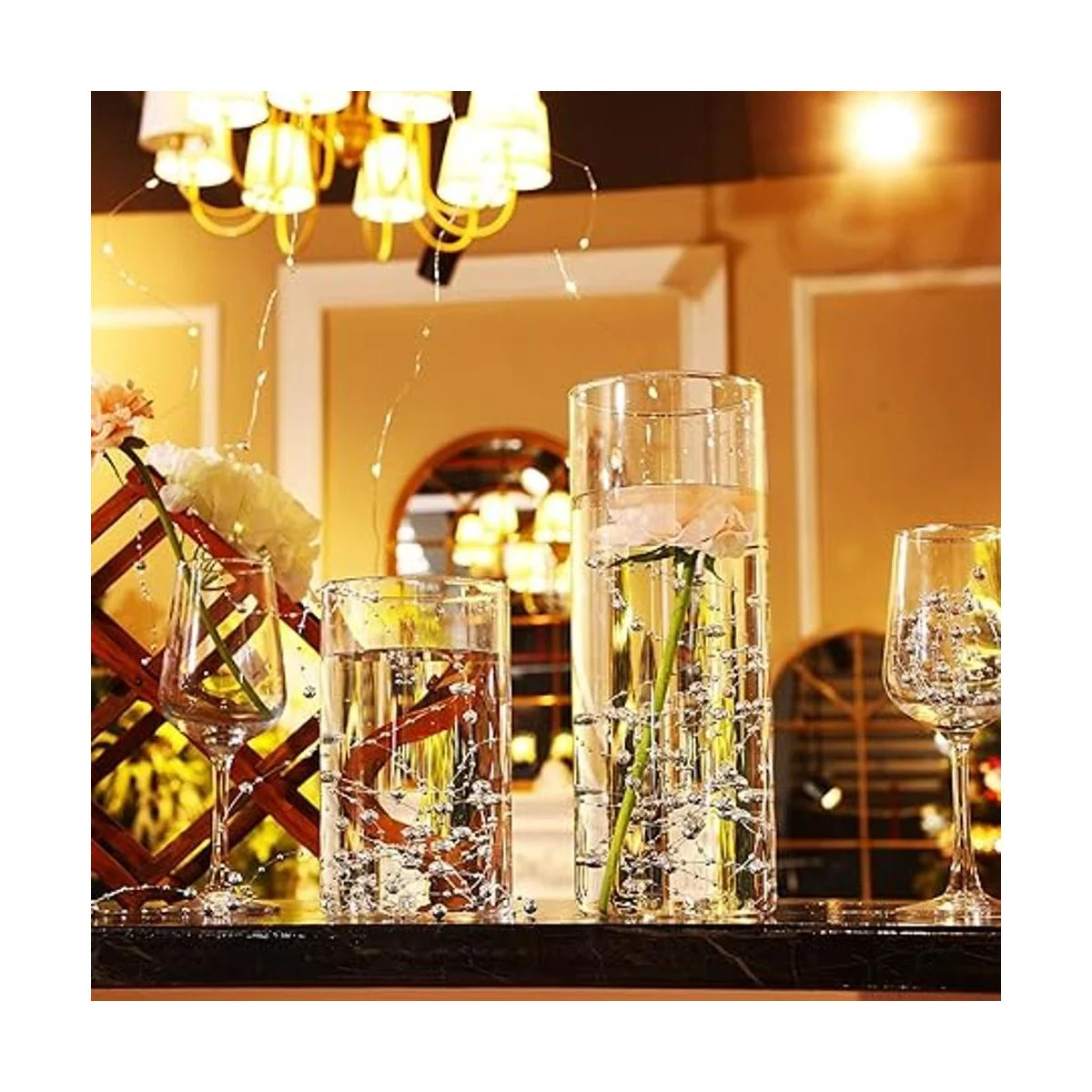 Material de calidad y fiable: nuestras perlas de imitación de línea de pesca para relleno de jarrón están hechas de material plástico de calidad con proceso de superficie de galvanoplastia, parecen estrellas brillantes en agua, sólidas y resistentes, resistentes al desgaste, resistentes al óxido y a la corrosión, seguras de usar y agradables para añadir glamour a tu celebración