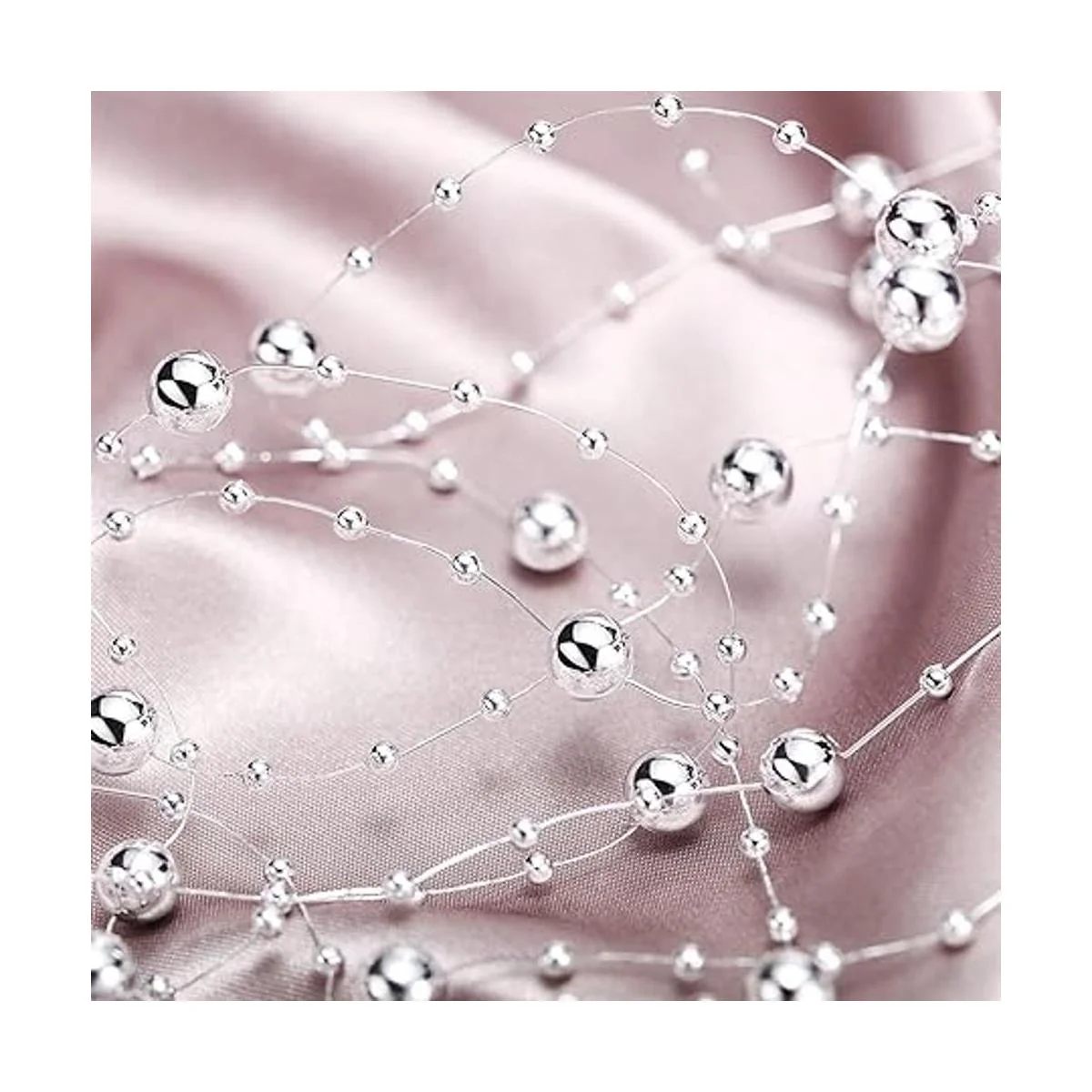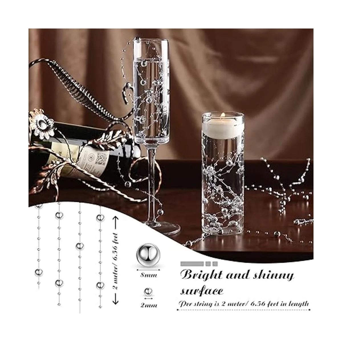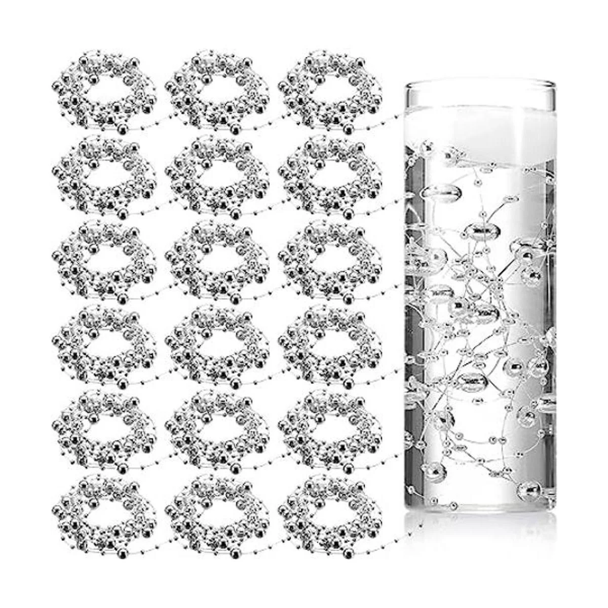 Cadena de perlas de 157 pies con 24 cuerdas para velas flotantes con reflejos de perlas de imitación para relleno de jarrón, para boda, mesa de comedor, fiesta, centros de mesa del hogar plateado