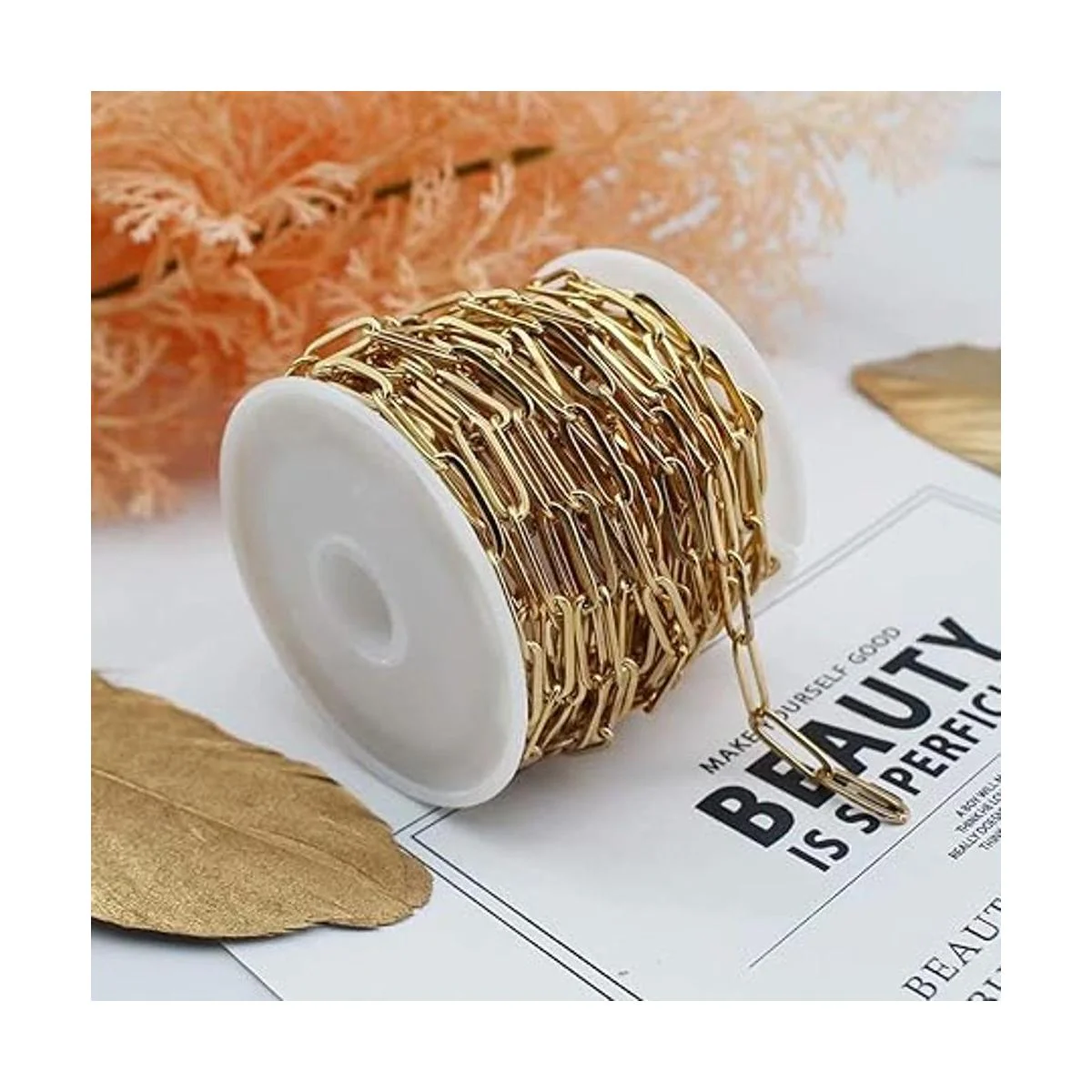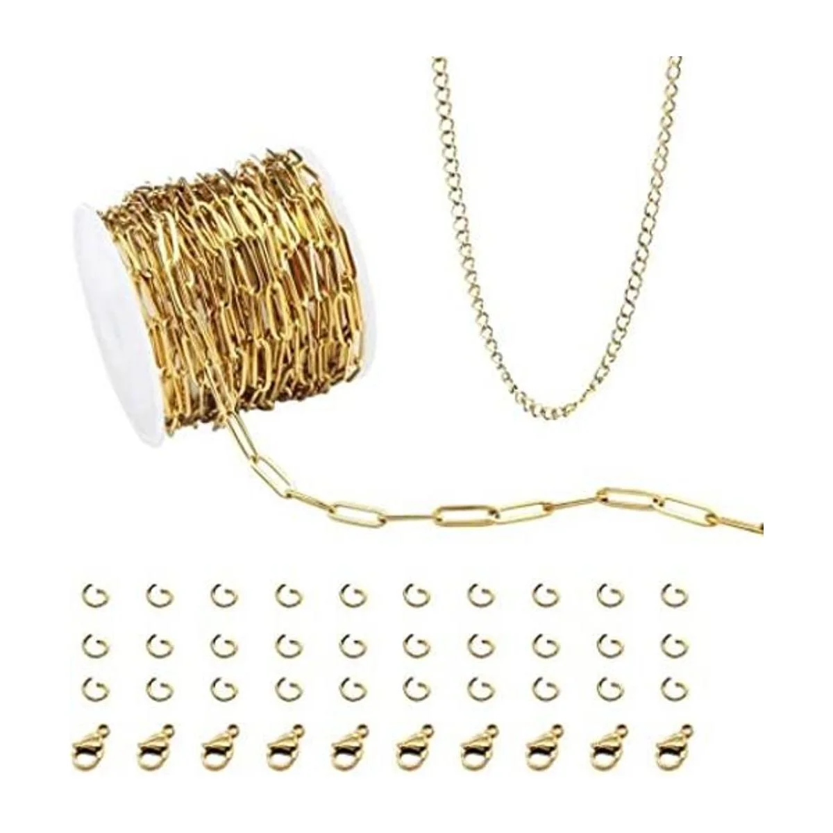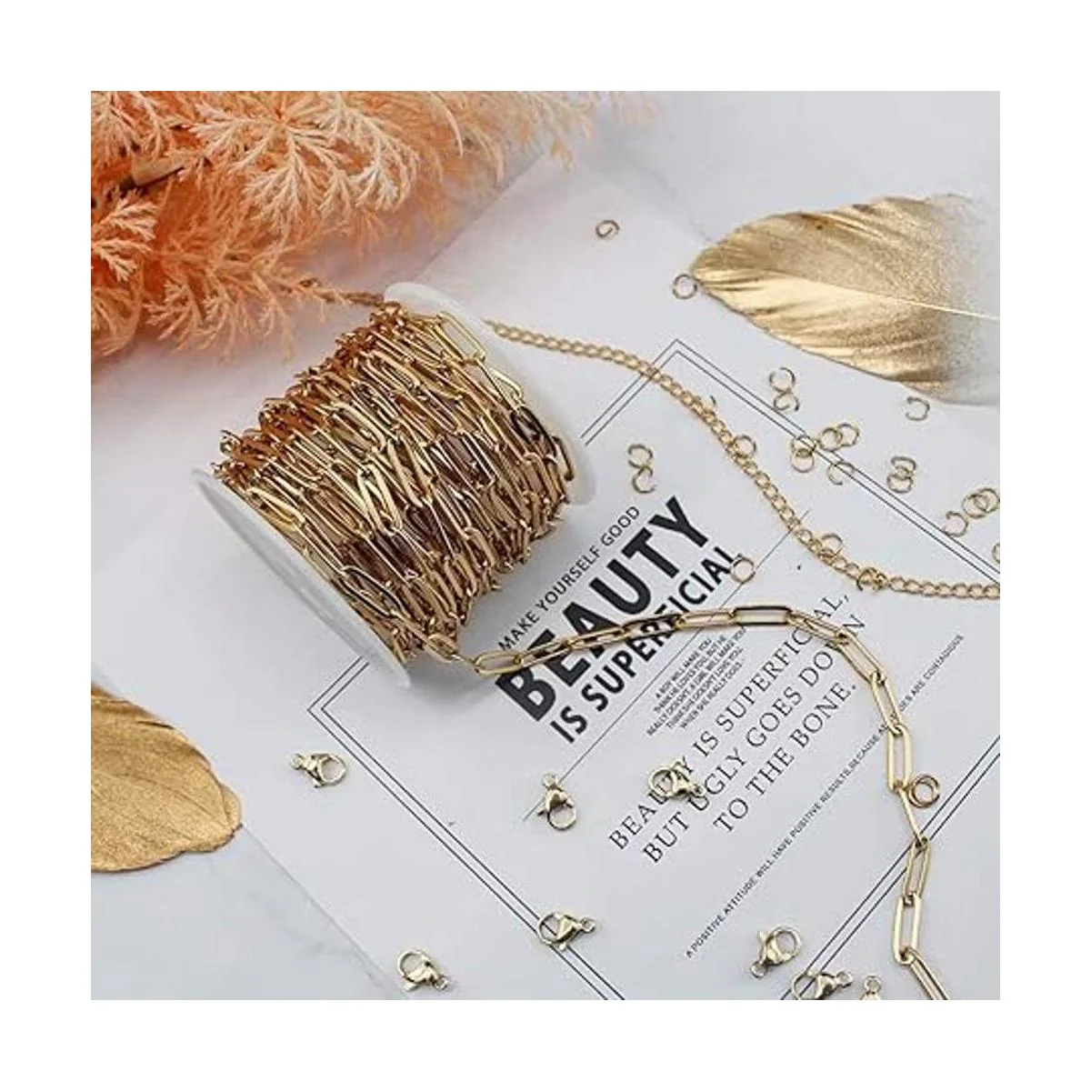 Cadenas planas de acero inoxidable chapadas en oro de 18 quilates, cadenas de eslabones de clip plano de papel de 16.4 pies con anillos para saltar, cierres de langosta, cadena extensora para hacer joyas de bricolaje
