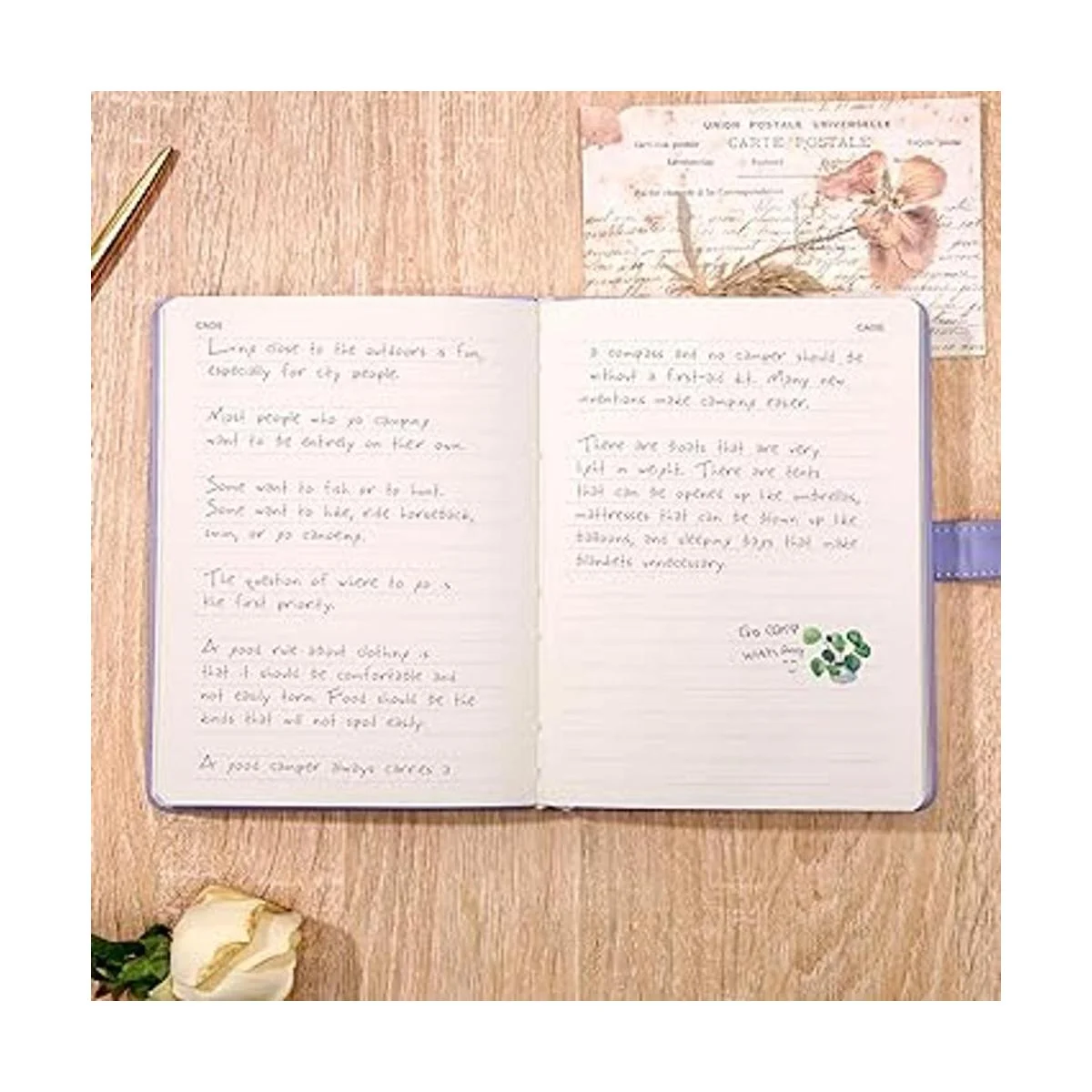 Características exquisitas: el tamaño de la cubierta es de 5.3 x 7.0 in. Este diario de tapa dura está hecho de piel de color lavanda, suave en las manos; exquisita cubierta de patrón; accesorios de oro rosa; bordes dorados; un bonito bolsillo frontal interior con forma de melocotón; marcapáginas de cinta de color; costura bilateral; caja de regalo con creativo patrón de bronceado.