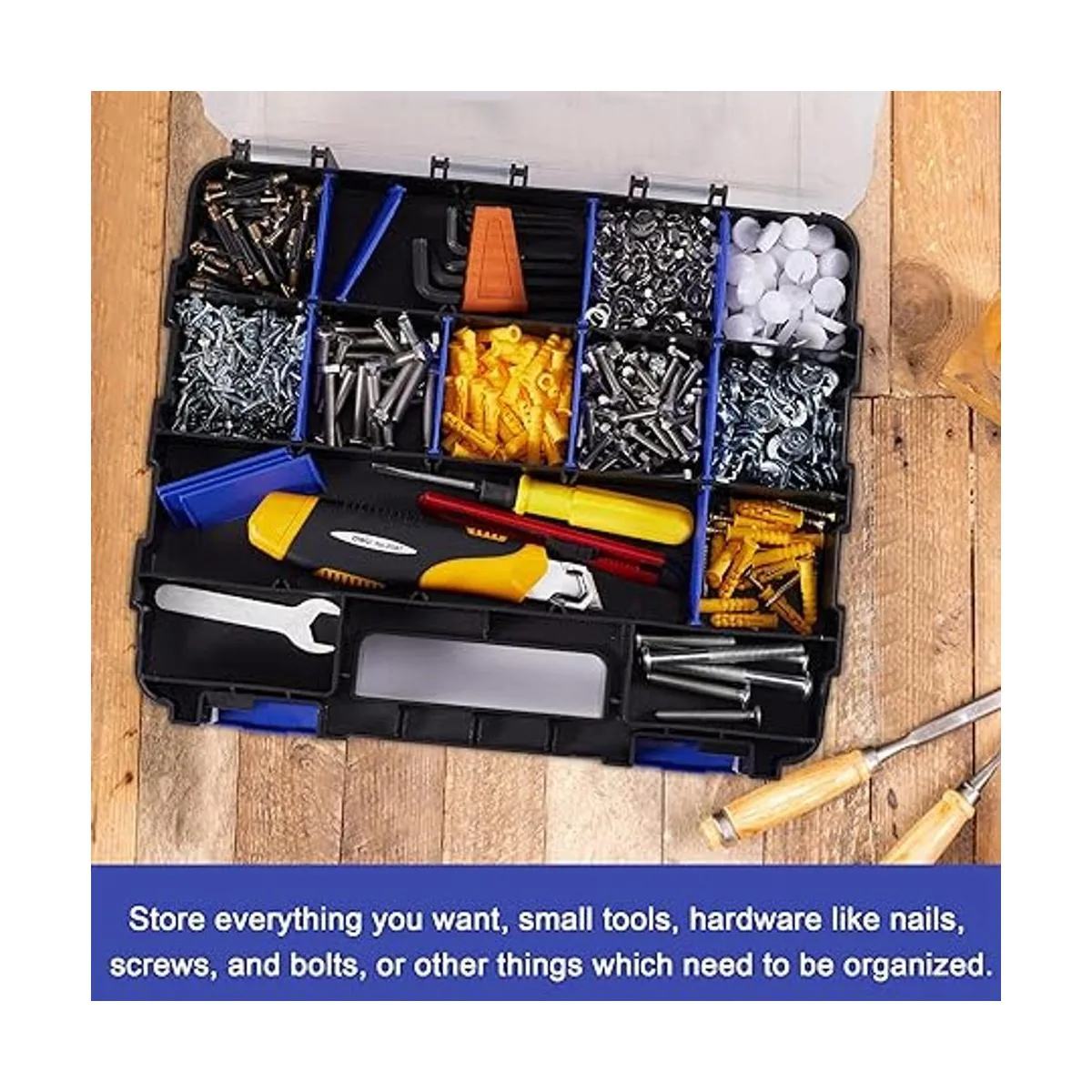 Organizador de herramientas de 34 compartimentos: diseño de doble cara, los separadores extraíbles se deslizan fácilmente para personalizar el espacio de almacenamiento, para almacenar herramientas, pernos, tornillos, piezas pequeñas, aparejos de pesca y muchos otros artículos
