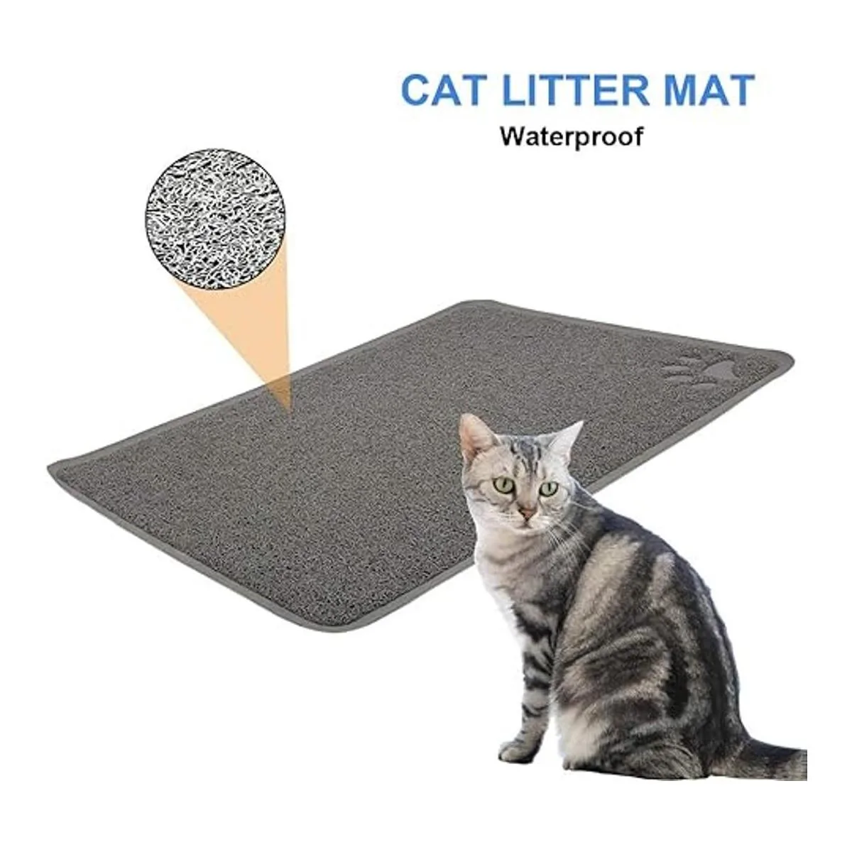 Kit de iniciación para gatos: una caja de arena gris 15.8 x 12.9 x 6.3 pulgadas borde más alto, 3.3 pulgadas borde más pequeño, una cuchara para caca gris, una alfombrilla de arena de espuma caqui claro 22.1 x 15.8 pulgadas y un cuenco de acero inoxidable con base de goma
