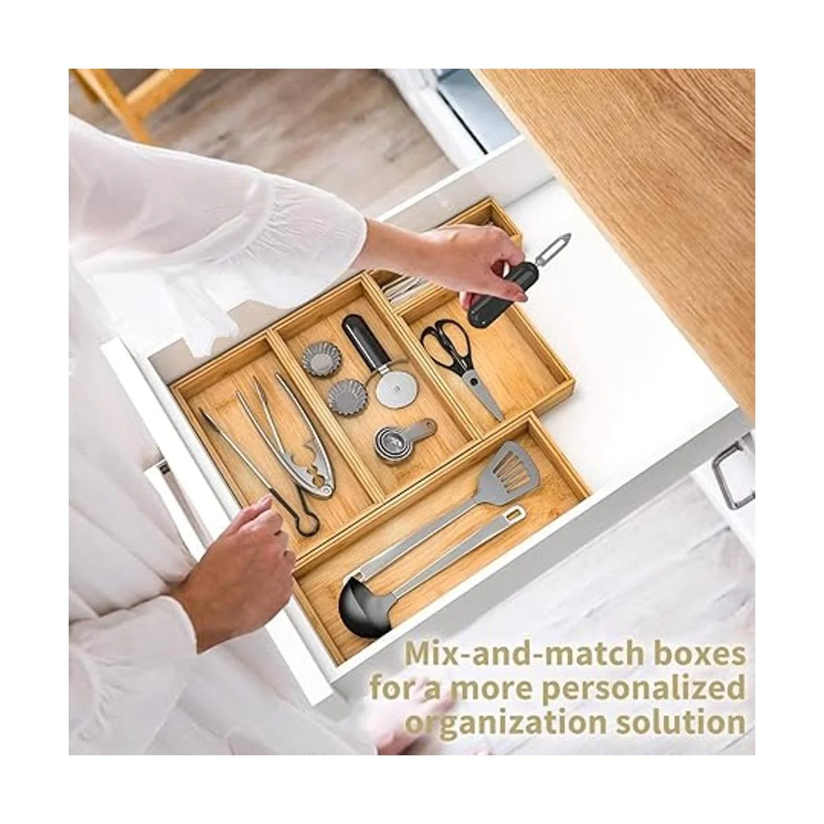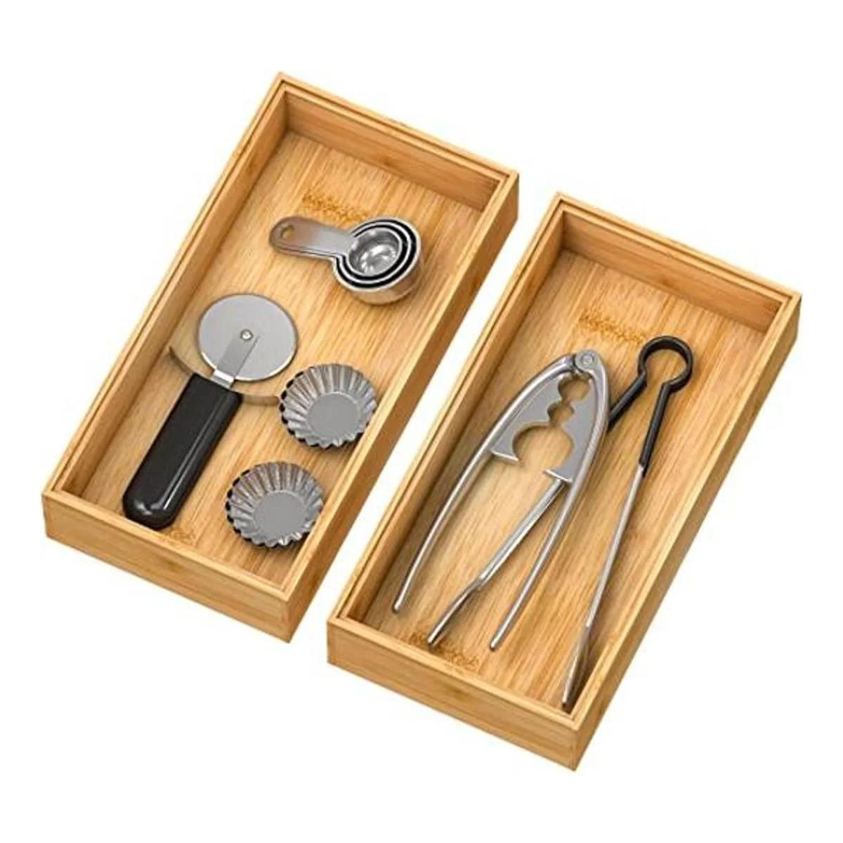 Organizador de cajones de cocina: esta caja de almacenamiento de bambú puede organizar accesorios de cocina, como juego de espátulas, cucharas medidoras, moldes de galletas, bolsas de té, tazas K, etc.