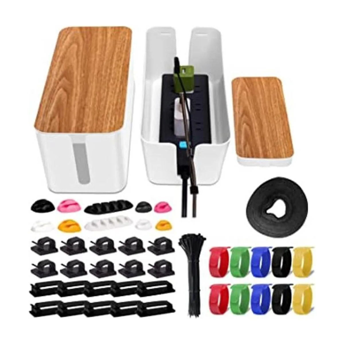 Caja de gestión de cables, 141 unidades para regleta de alimentación con 2 cajas organizadoras de cables y organizador de cables de clips de cables y funda de cables para ocultar cables y cables para el hogar y la oficina blanco