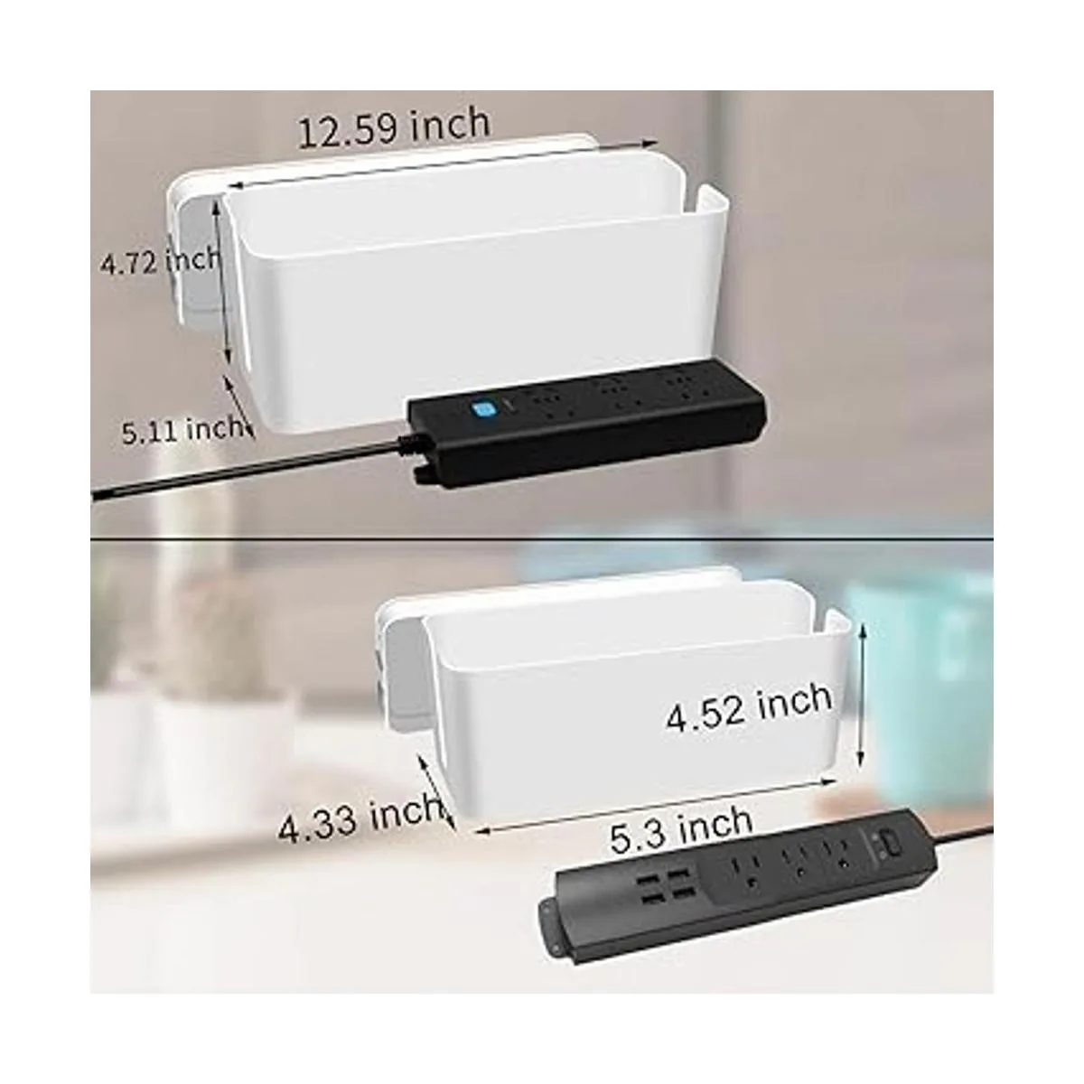 Paquete de 2 cajas de gestión de cables para regletas de alimentación: caja grande de regleta 12.59 x 5.11 x 4.52 pulgadas y pequeña 5.3 x 4.3 x 4.52 pulgadas. Las cajas de cable se adaptan a la mayoría de tiras de alimentación estándar de 5 a 12 tomas. 2 minutos para acabar con el desorden de cables: almacena todos tus cables y aparatos de salida, incluyendo cargador, múltiples regletas de alimentación, cables, adaptadores, cables HDMI, etc. en un lugar conveniente y seguro y mantiene todos tus cables de accesorios siempre ordenados y libres de polvo.