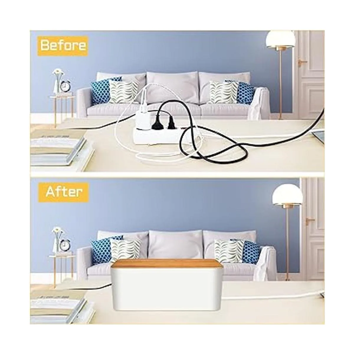 El estilo cumple con las cajas organizadoras de cables prácticas: las cajas organizadoras de cables tienen un elegante acabado blanco mate y grano de madera simulado, el ocultador de cables se mezcla con cualquier decoración. Un organizador de cables de oficina en casa y escritorio oculta y protege los cables y las regletas de alimentación que pueden ayudar a evitar que las regletas de alimentación o equipos eléctricos o cables toquen la alfombra o el suelo.