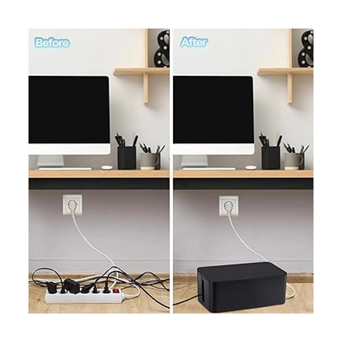 10 minutos para terminar el desorden del cable: muy fácil de usar. Almacena y oculta todos tus cables, aparatos de salida, cargador, protector contra sobretensiones, múltiples regletas de alimentación, cables, adaptadores, cable HDMI, etc. en un lugar conveniente y seguro e incluso mantenlos siempre ordenados y libres de polvo para prolongar su vida útil.