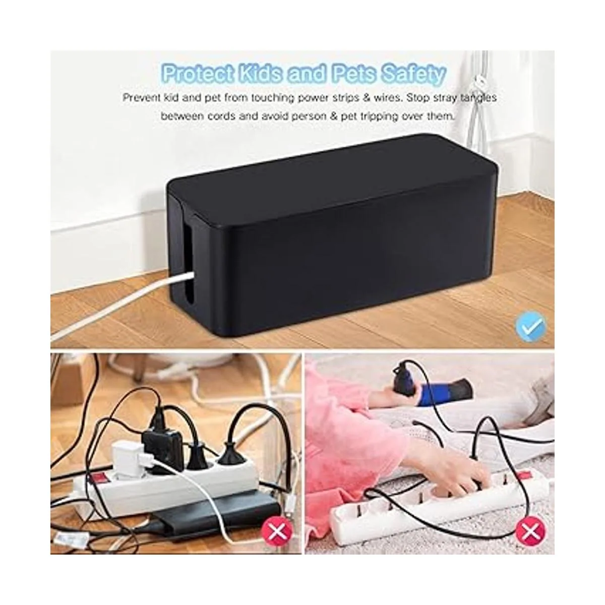 Protege la seguridad de los niños y las mascotas: evita que los niños y las mascotas toquen tiras de alimentación y cables peligrosos. Detiene los enredos entre los cordones y evita que la persona y la mascota se tropiezen sobre ellos. Evita eficazmente que el agua salpique en el cable y la regleta de alimentación.