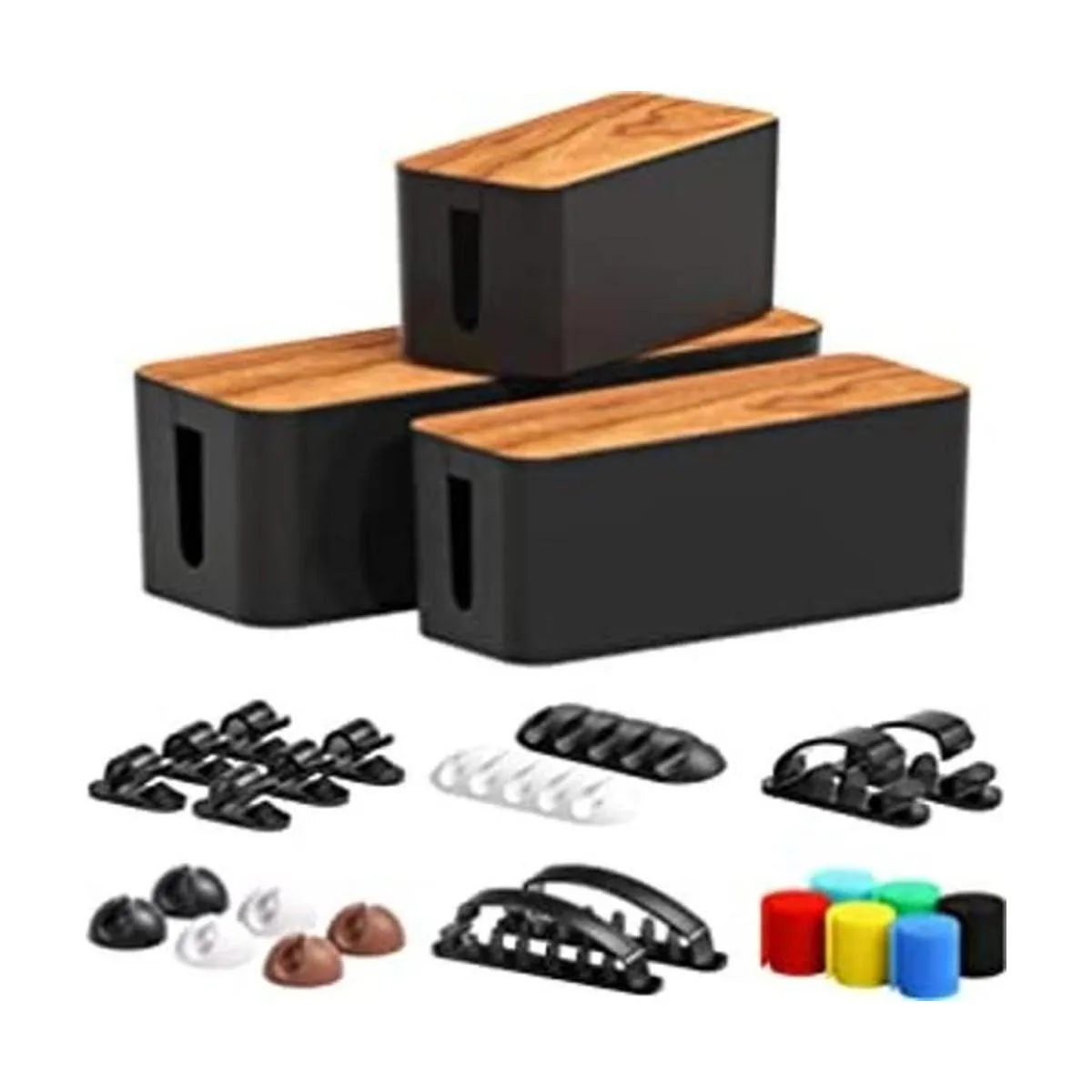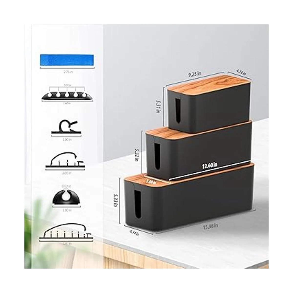 Caja de gestión de cables, paquete de 3 con 16 clips de cable, caja organizadora de cables de madera grande, mediana y pequeña, para ocultar cables y tiras de alimentación, caja organizadora de cables, organizador de cables para el hogar y la oficina Negro