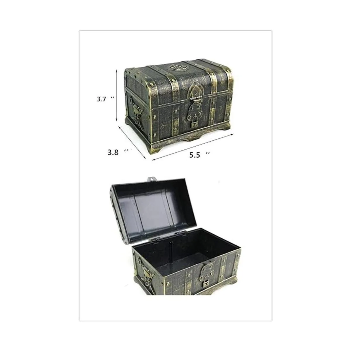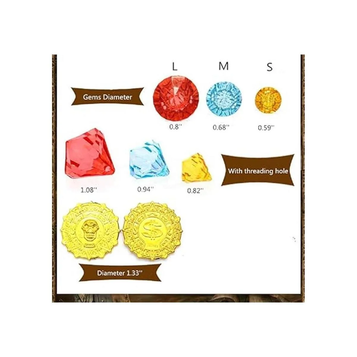 La caja del tesoro mide 5.5 x 3.8 x 3.7 pulgadas largo x ancho x alto, pecho interior con juguete del tesoro de 100 monedas de oro de plástico, gemas coloridas de 3.53 oz, 2 anillos, 2 aretes y 1 collar