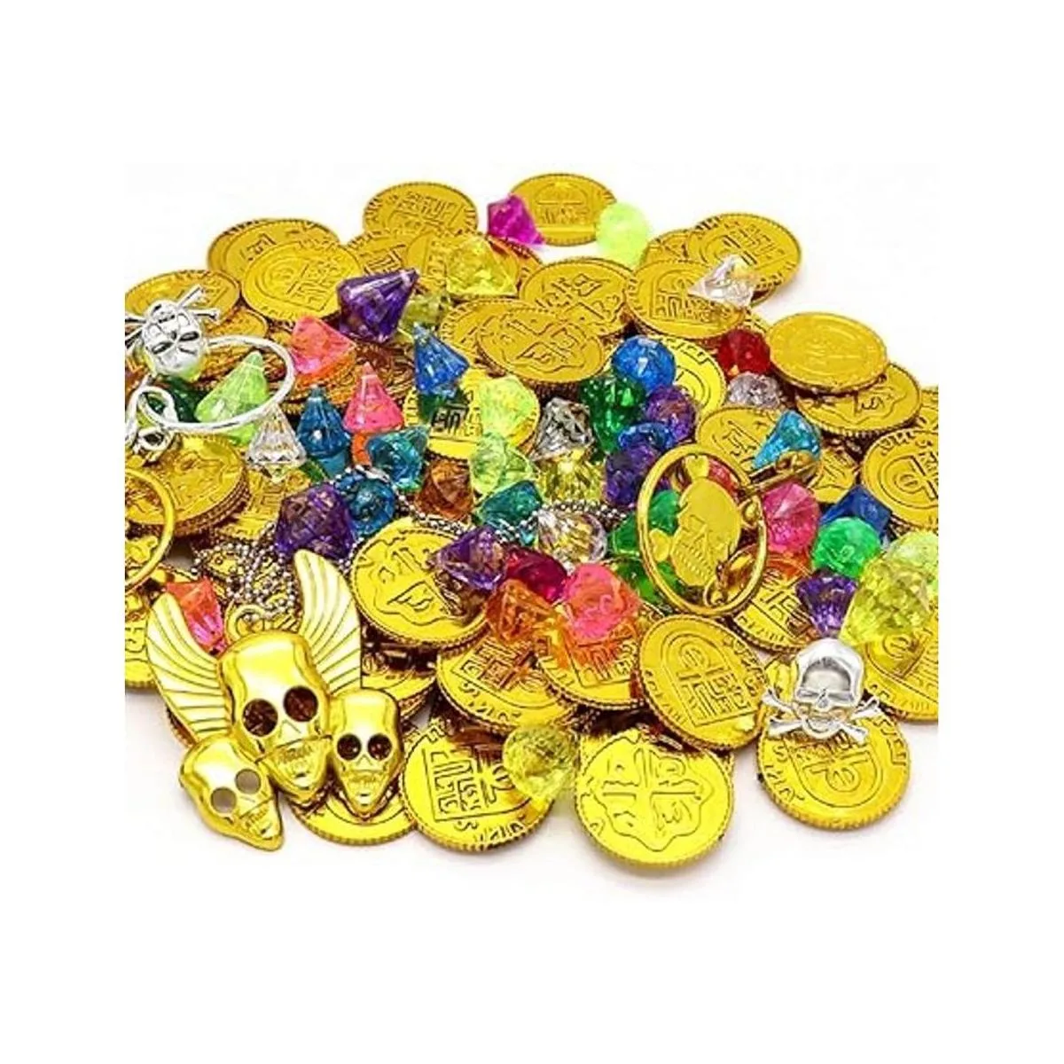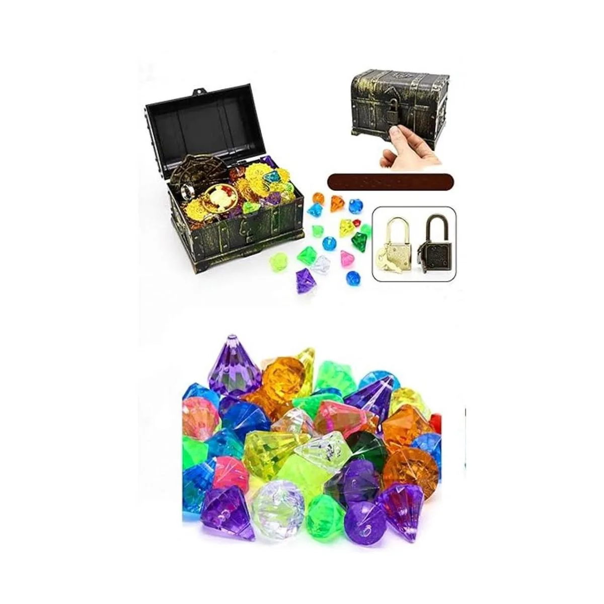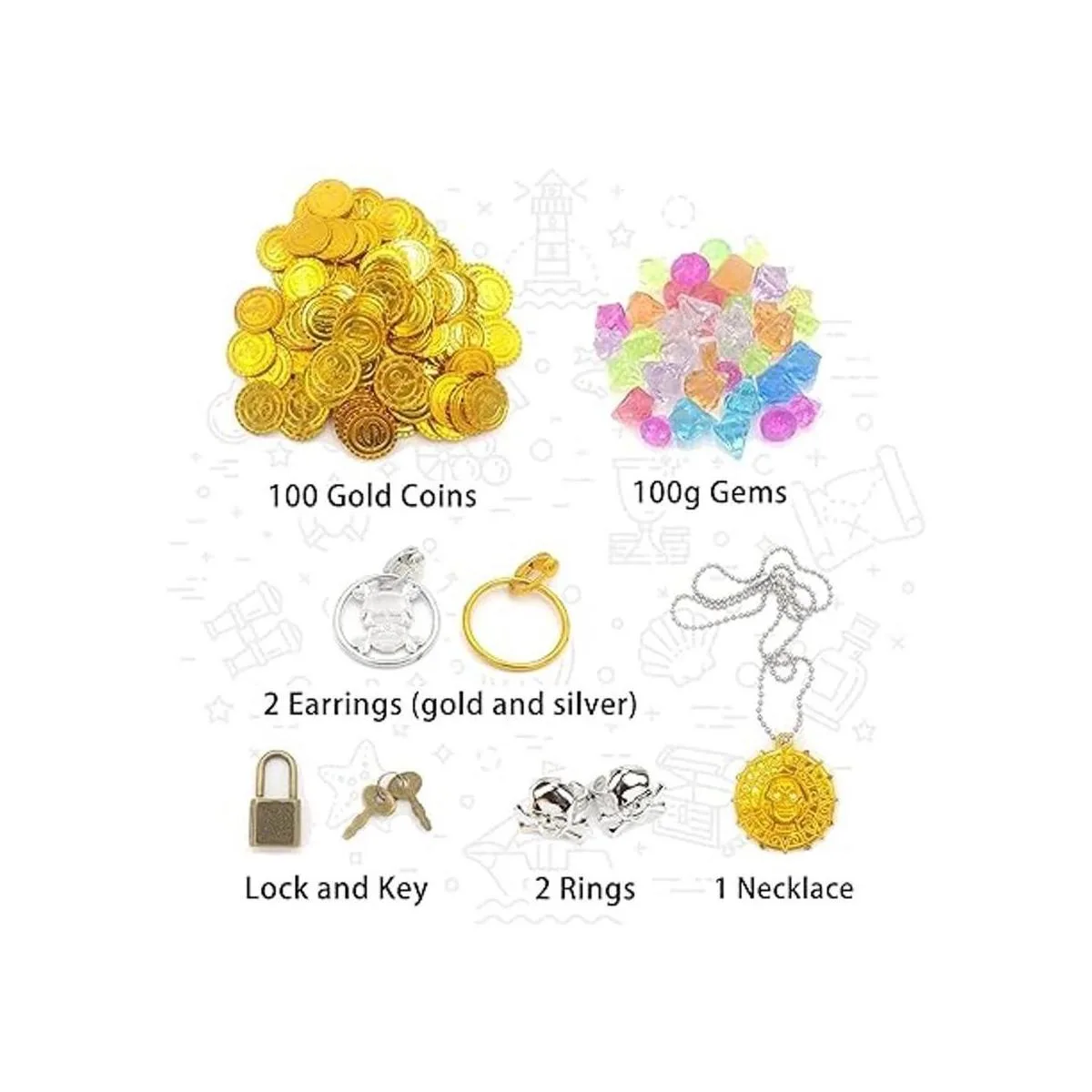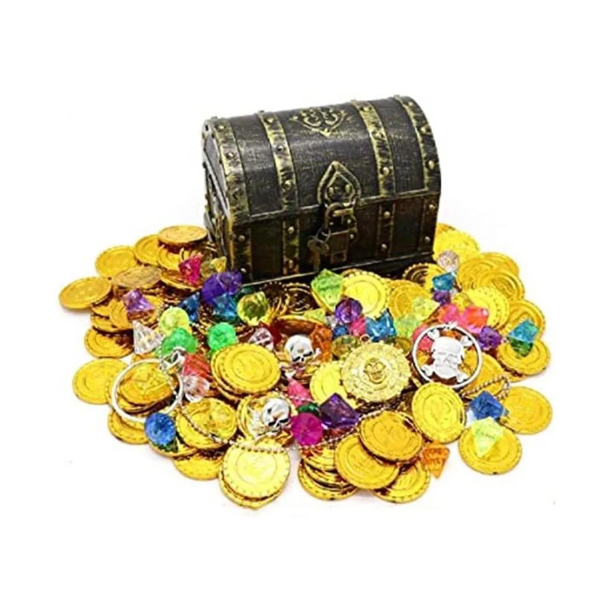 Caja de juguetes para niños con cofre del tesoro pirata de color antiguo con cerradura para recuerdos de fiesta, accesorios de decoraciónalmacenamiento de niños con 100 monedas de oro de plástico 3.53 oz de gemas 2 aretes2 anillos 1 collar