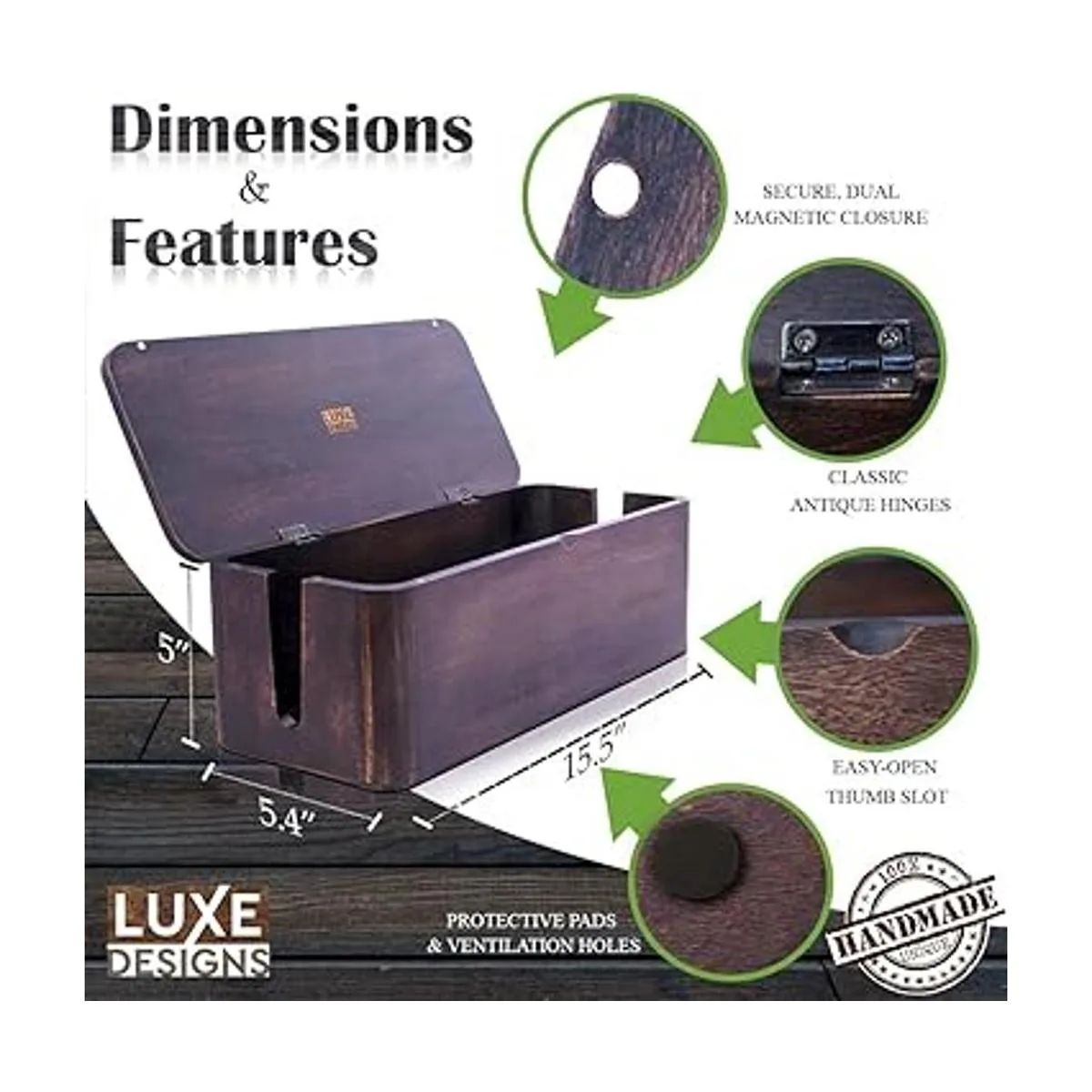 Llamativa artesanía hecha a mano: cada caja de cables está hecha a mano y acabada a mano por artesanos con un suave acabado de madera quemada oscura para que coincida con cualquier decoración. Las variaciones en cada pieza hacen que tu producto sea completamente único. Lo suficientemente grande para la mayoría de protectores de sobretensiones de 16 pulgadas de largo, 5.1 pulgadas de alto 6.8 pulgadas de ancho.