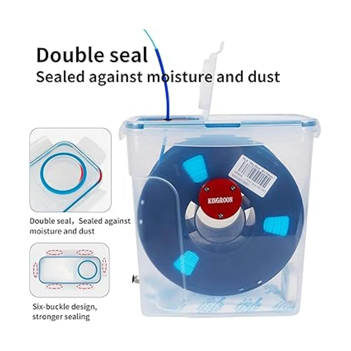 2. El anillo de doble sellado mantiene el filamento seco y mejora el efecto de impresión: diseño de anillo de sellado doble de seis bayonetas, puede almacenar el filamento durante mucho tiempo sin fuente de alimentación, y proteger tu filamento de la humedad y la suciedad, puedes poner desecantes dentro de la caja de la secadora para mejorar la eficiencia y la calidad de secado.