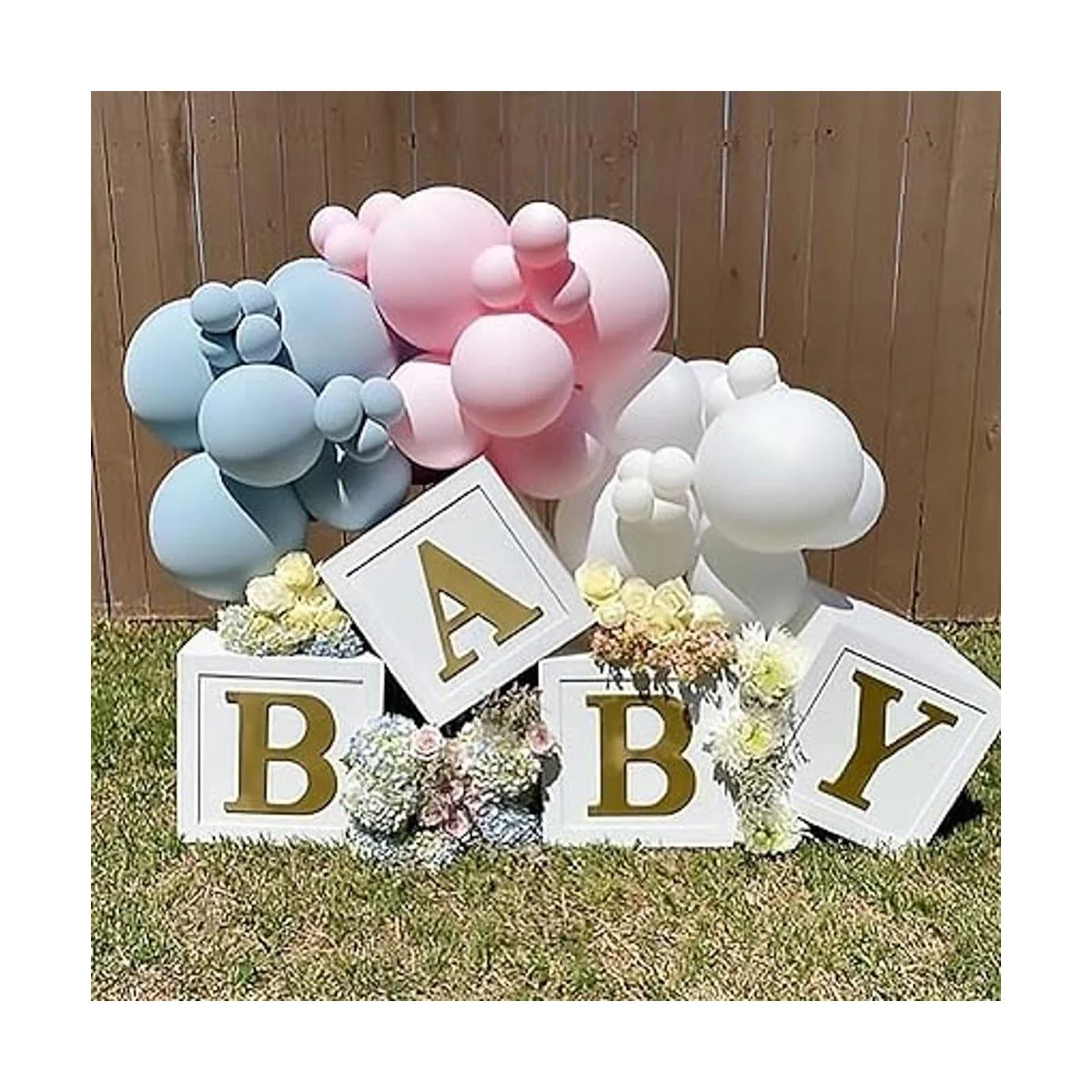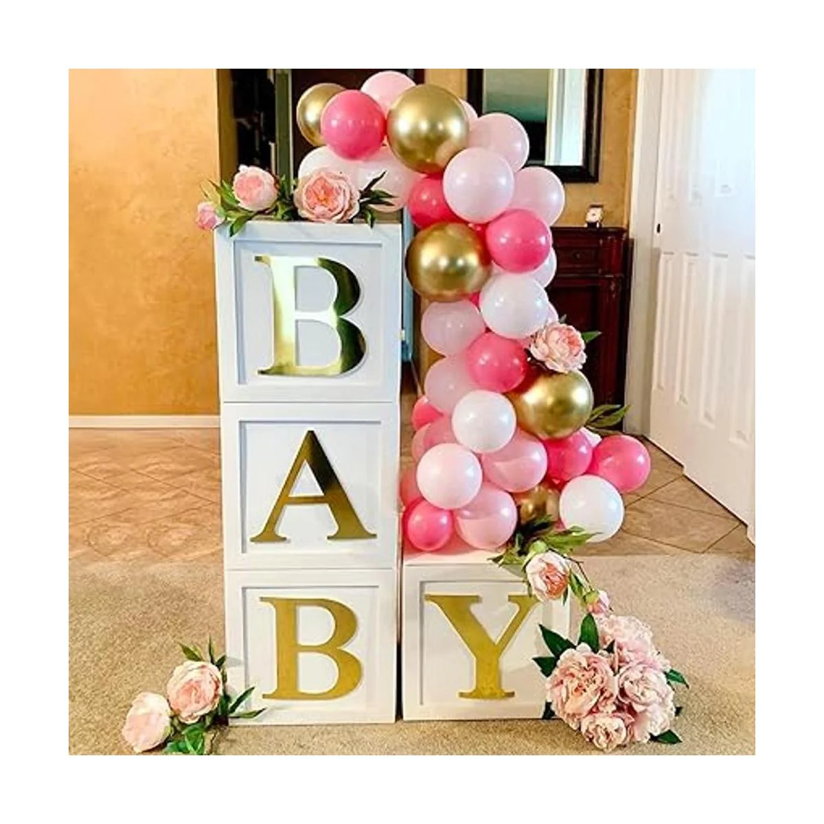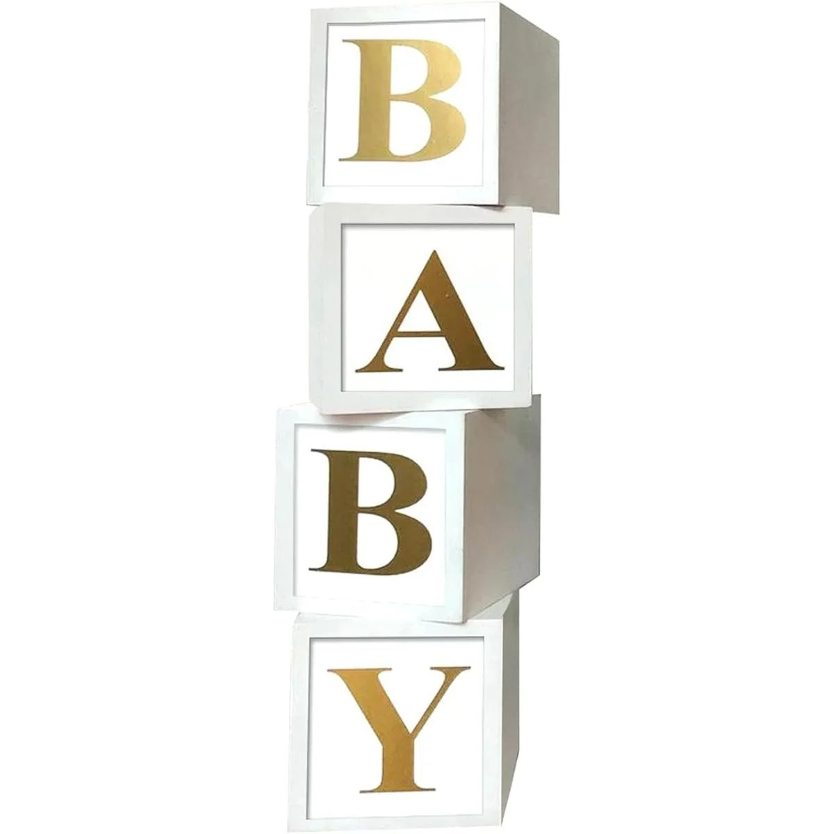 Cajas de baby shower, decoraciones de fiesta, 4 cajas estereoscópicas blancas para bebés con letras doradas para bebés AZ, cajas de fiesta, bloques de bebé para niños y niñas, decoraciones de baby shower, revelación de género, telón de fondo de fiesta de cumpleaños