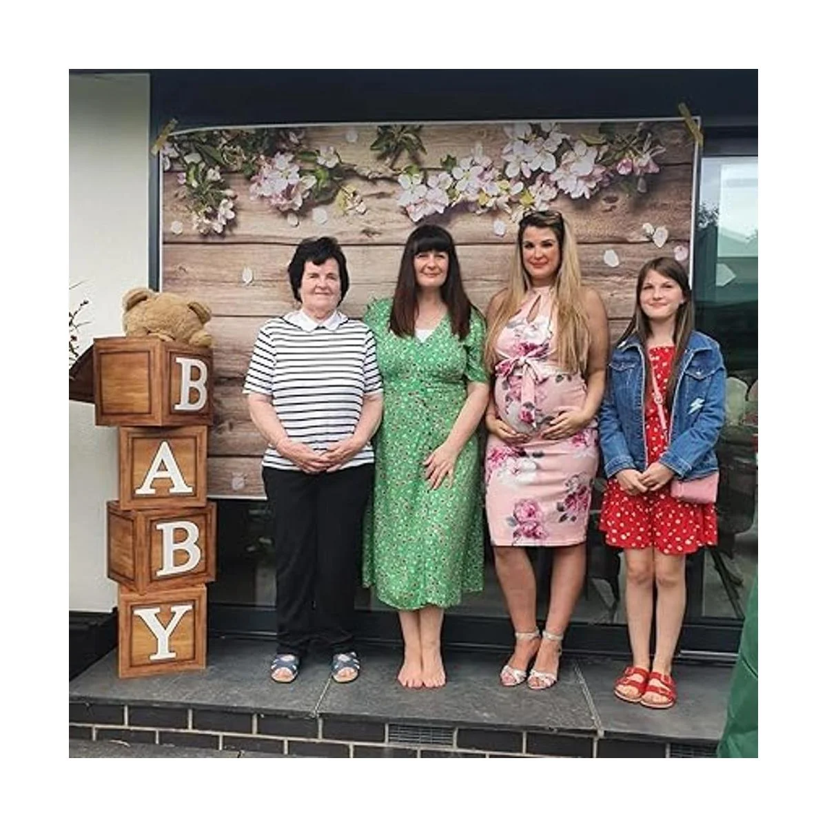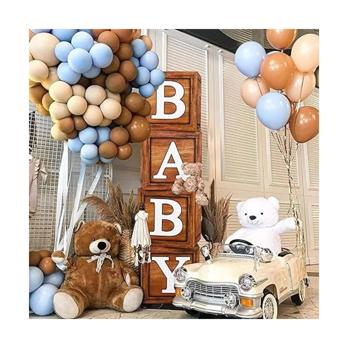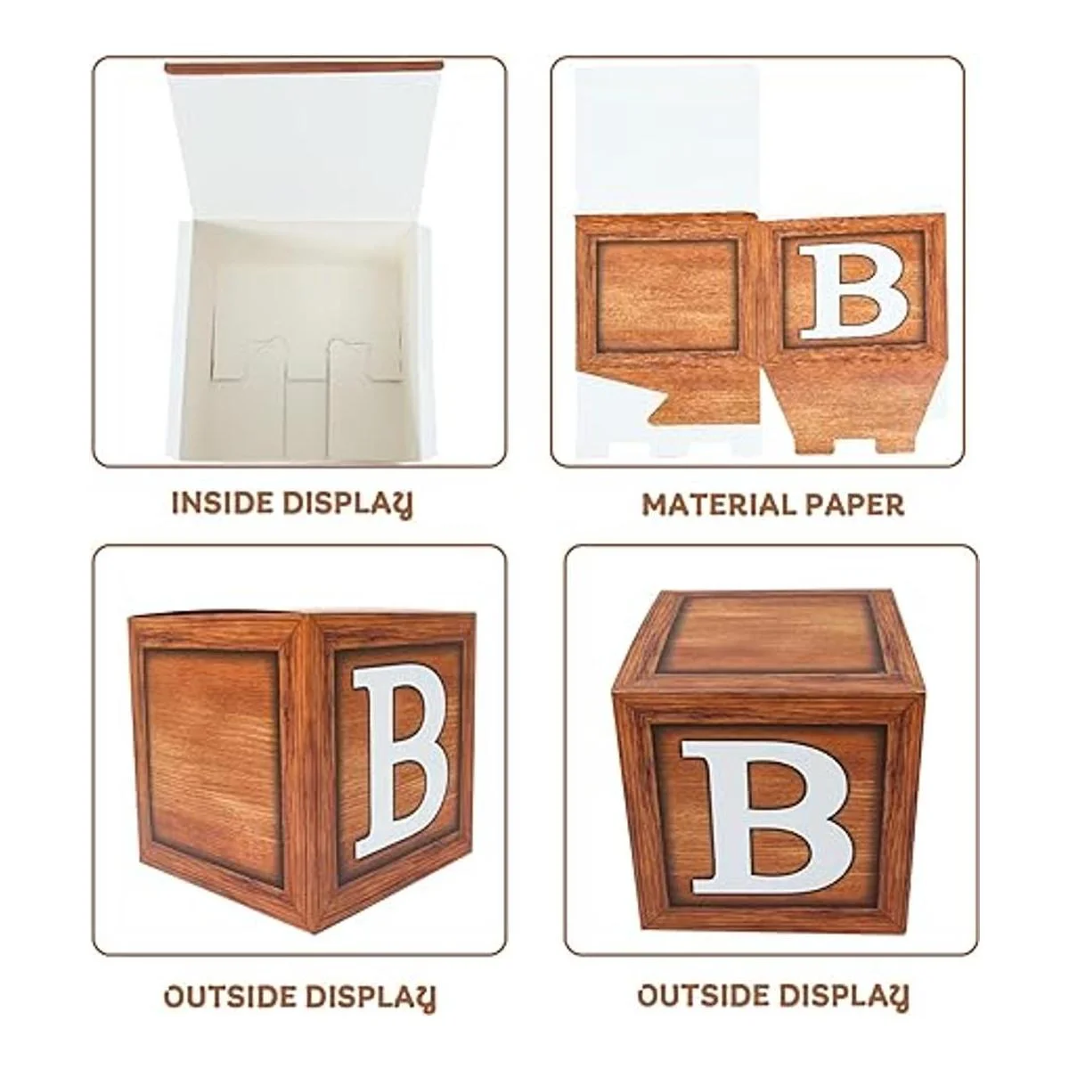 Cajas de baby shower para decoraciones de fiesta de cumpleaños, 4 bloques de grano de madera marrón con letra de bebé, letras impresas, decoración de centro de mesa de primer cumpleaños, suministros de baby shower, telón de fondo de revelación de género