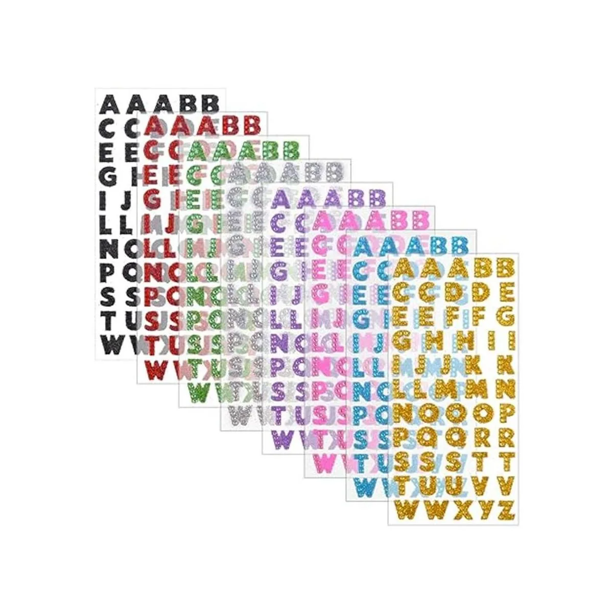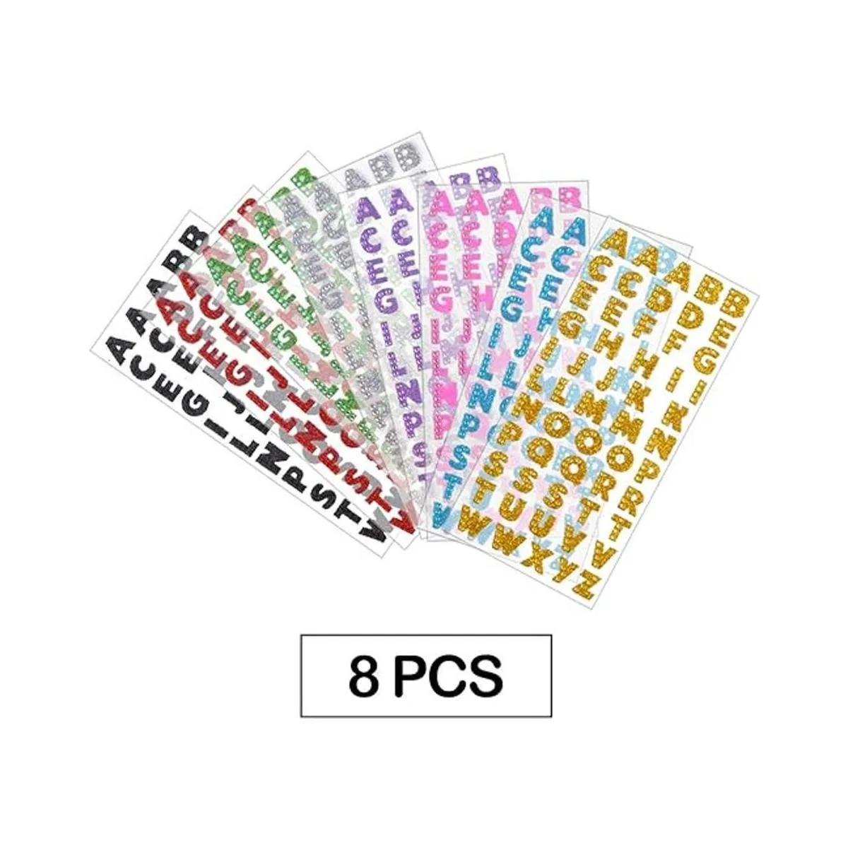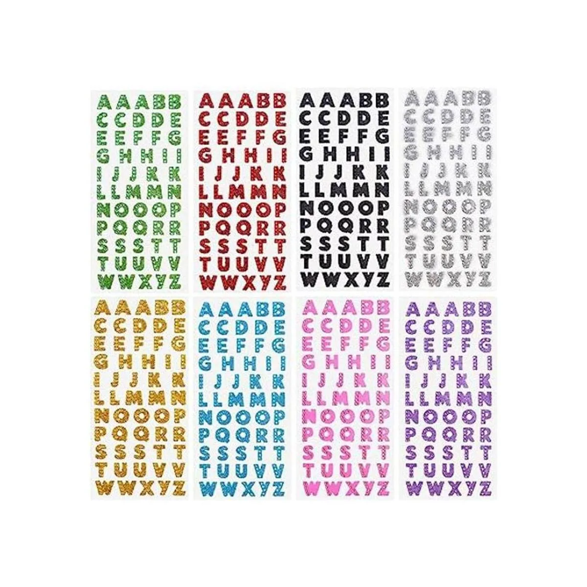 Calcomanías coloridas del alfabeto: el paquete incluye 8 hojas de calcomanías brillantes en 8 colores diferentes plata, oro, negro, morado, rojo, azul, rosa y verde, 1 hoja para cada color.