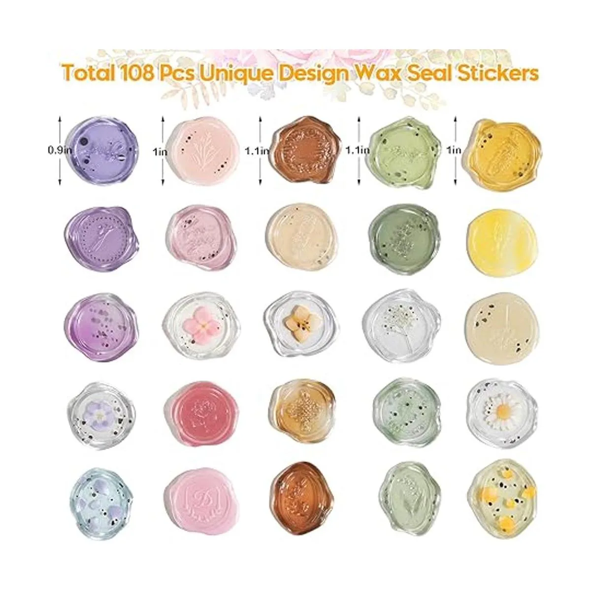 Diseño único: el paquete viene con 108 calcomanías de sellado de cera de diseño único, cuenta con múltiples colores como oro, rosa, rojo y verde con letras en relieve o flores de aluminio. Perfecto para regalos de boda o decoraciones de regalo.