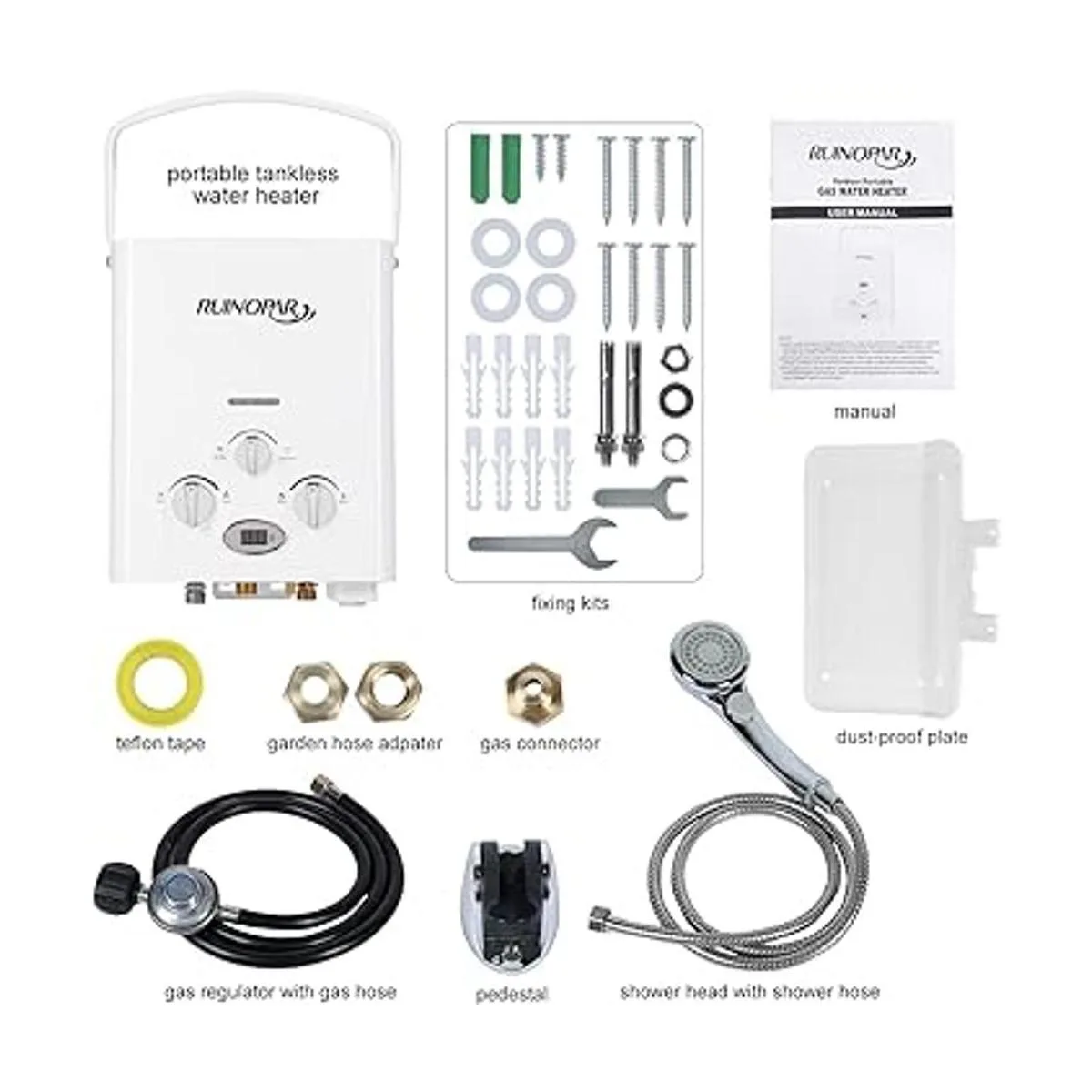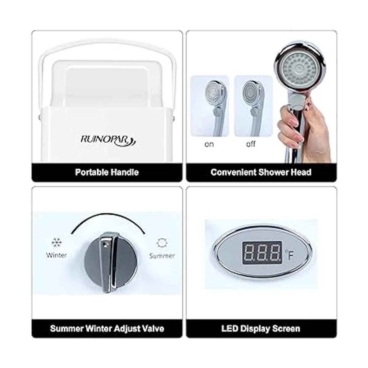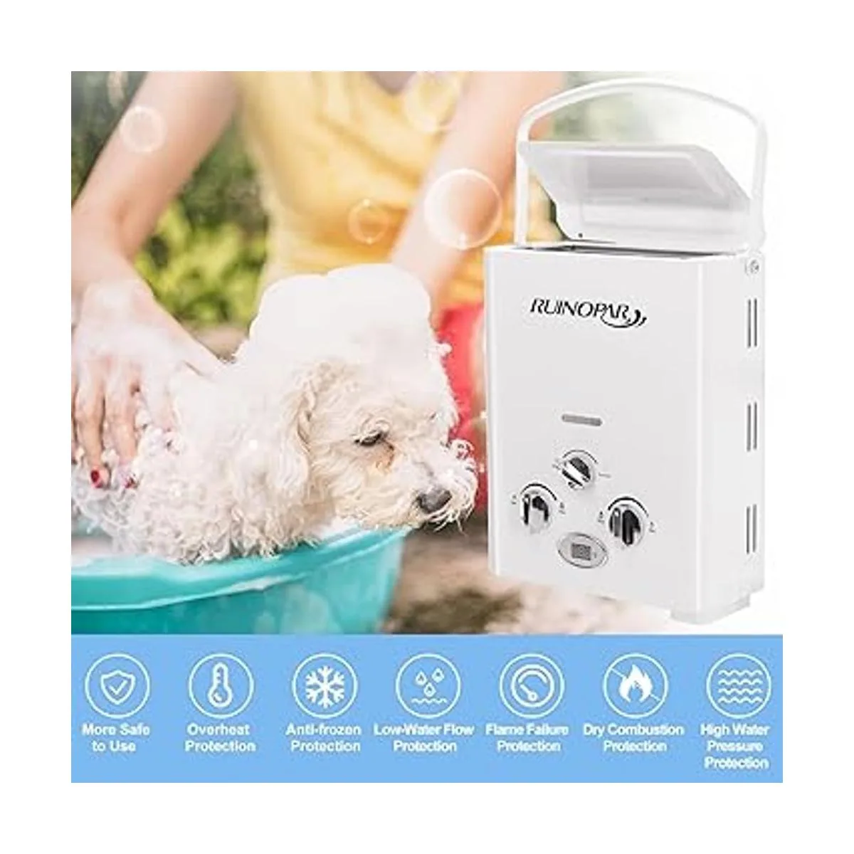 Seguridad aprobada por la CSA: calentador de agua sin tanque RUINOPAR con regulador aprobado por la CSA, seguro según las normas canadienses y estadounidenses. Disminuye automáticamente la presión del agua entre 2.5 y 145 PSI. El tapón de drenaje anticongelante puede descargar el agua residual para evitar la congelación en zonas frías o en caso de largo tiempo sin uso. Protección de alta temperatura del agua a más de 167 F. Apaga el suministro de gas automáticamente bajo una llama inesperada.