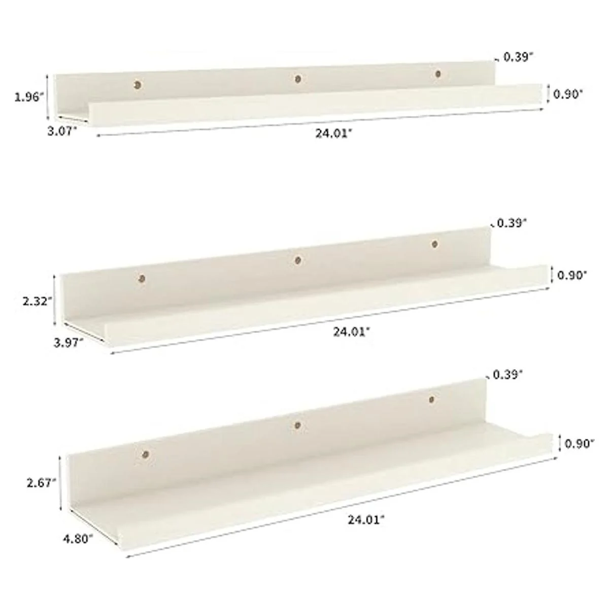 Estantes flotantes de diferentes tamaños: el juego de 3 estantes montados en la pared viene con diferentes dimensiones y profundidad para mostrar tus marcos de fotos, libros, plantas pequeñas o lo que quieras. L: 24.02 x 5.51 x 2.68 pulgadas, M: 24.02 x 4.70 x 2.32 pulgadas, S: 24.02 x 3.81 x 2 pulgadas.