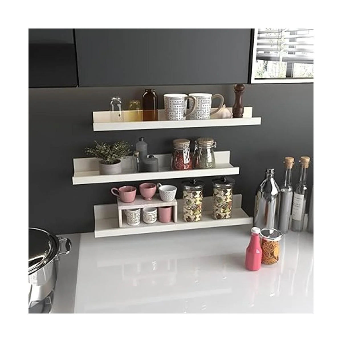 Estantes funcionales para ahorrar espacio: nuestros estantes ofrecen un espacio de almacenamiento adecuado es ideal para mostrar tus fotos preciadas, discos de vinilo, artículos decorativos y coleccionables. También se pueden utilizar como estantes de almacenamiento para el hogar y estante de especias de cocina.
