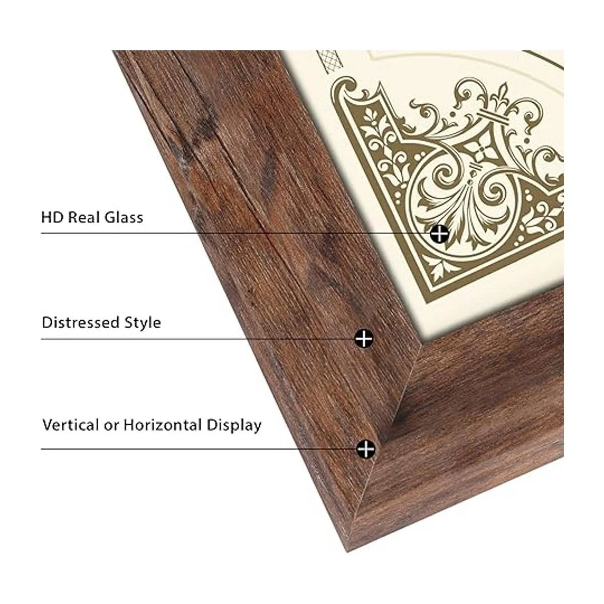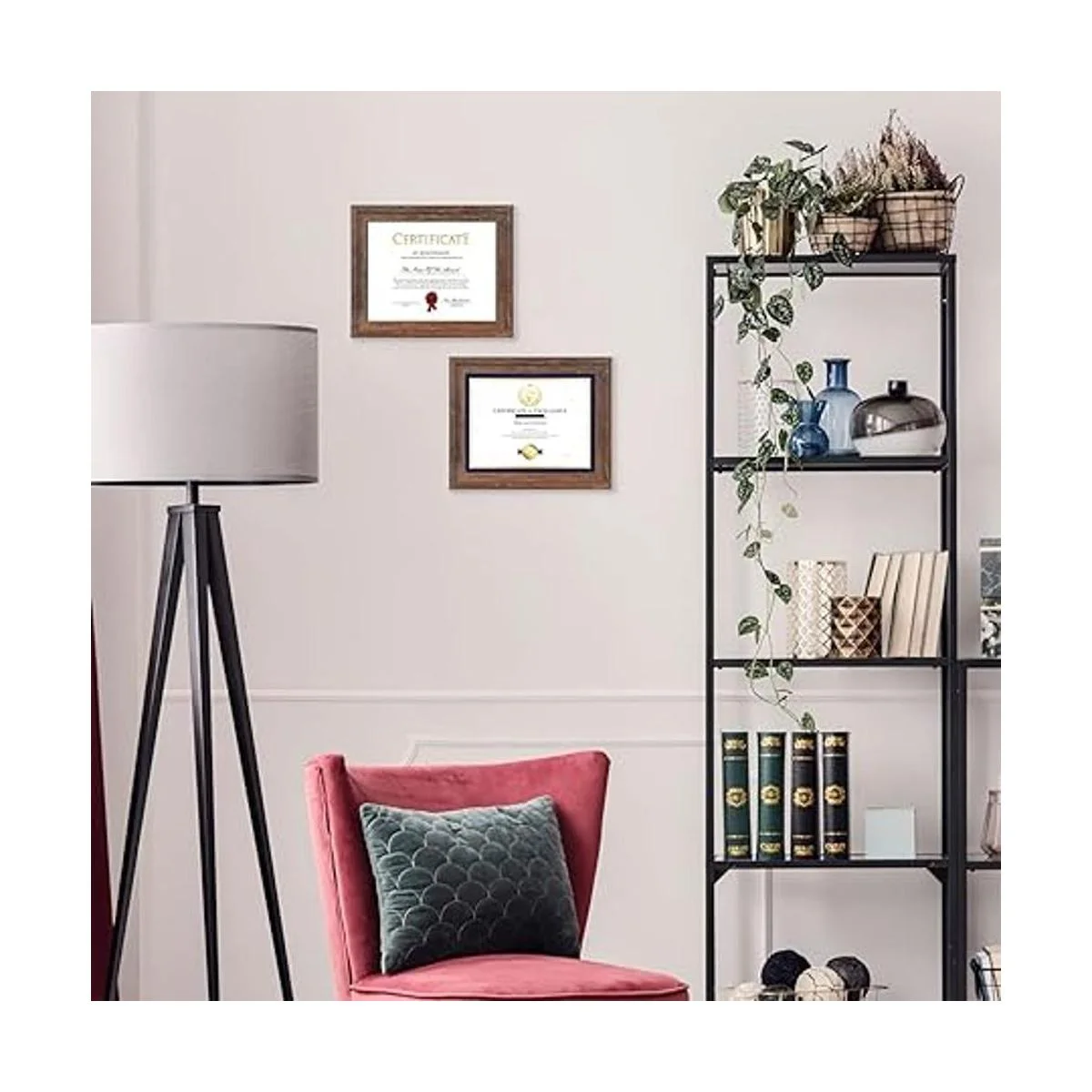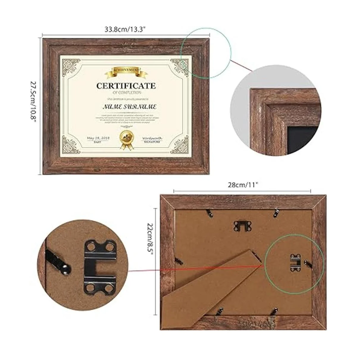 Doble función. Los marcos de certificados con caballete trasero se pueden mostrar en la mesa vertical u horizontalmente. Los accesorios para colgar incluidos se pueden colocar en orientación vertical u horizontal.
